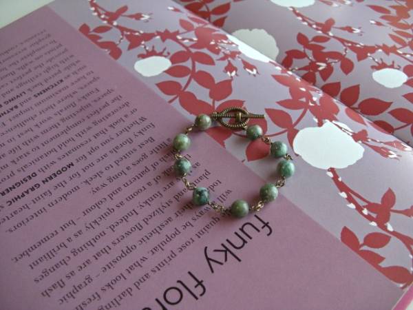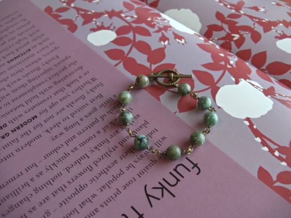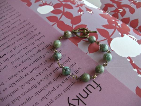 ビター・ガール・・シリーズです♪初夏のターコイズ・・シックなターコイズのブレスレットです♪深緑色のターコイズが可憐な表情です♪8ミリ位の丸玉のターコイズはクラシカルなマンテルを合わせました♪長さは全長19センチ位です♪お揃いのネックレスやイヤリングやリングも出品しています♪シンプルで飽きのこないいつまでも着けられるデザインを考えて作りました!ハンドメイドをご理解頂いてノークレーム、ノーリターンでお願いします