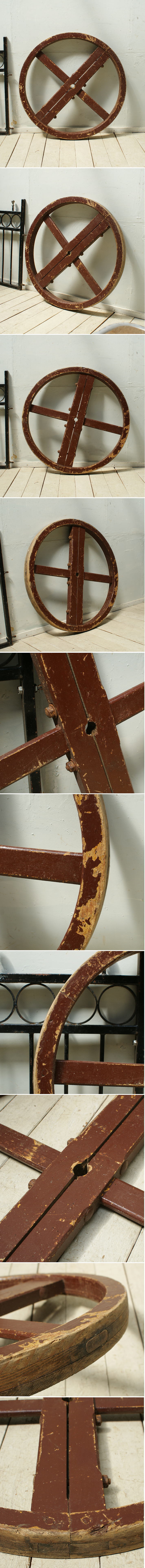 イギリスの蚤の市で見つけてきた古い 木製の大きいサイズの車輪です。 使い込まれた風合いがとても素敵です。 ガーデンオーナメント等にいかがですか。 お花屋さん等のショップディスプレイにも オススメです。 虫食い跡ありますが、(画像参照)しっかりとして、ガタツキ等なくコンディション良好です。お花屋さんや雑貨屋さん等ショップディスプレイにもオススメです。 サイズの割りに軽いです。   サイズ直径約80.5cm  奥行き6.5cm                   年代推定1930~1950年代