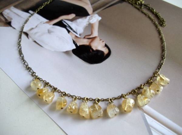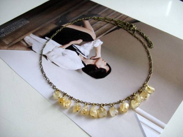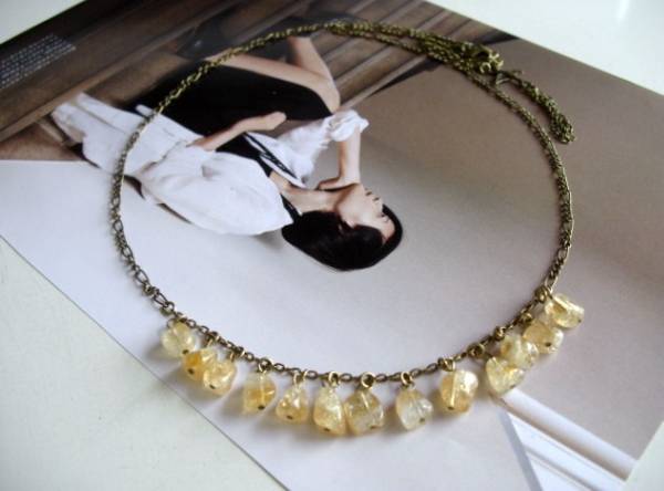 儚さを重ねて・・シリーズです♪初夏のシトリン・・繊細なシトリンのネックレスです♪さりげなく華やかな表情です♪9ミリから10ミリ位のラフタンブルのシトリンをデザインチェーンに繋ぎました♪長さは58センチ+アジャスター10センチで最長68センチ位です♪お揃いのブレスレットも出品しています♪♪シンプルで飽きのこないいつまでも着けられるデザインを考えて作りました!ハンドメイドをご理解頂いてノークレーム、ノーリターンでお願いします