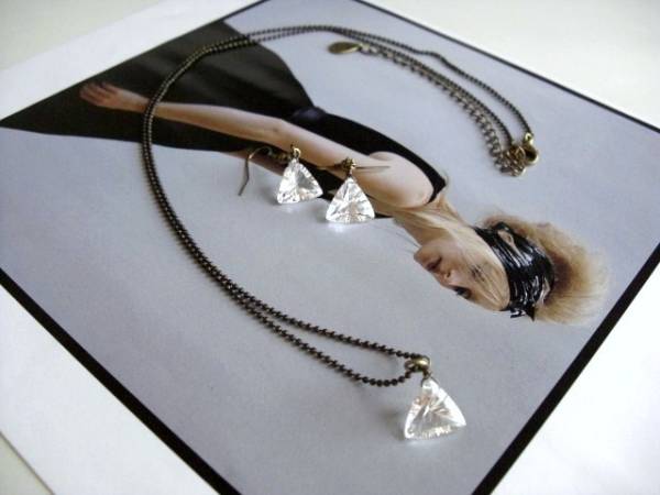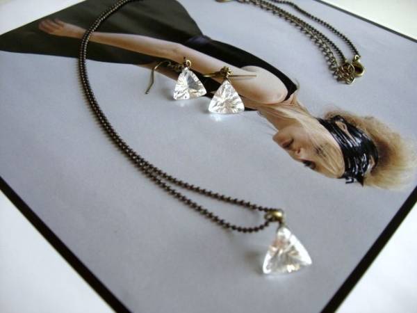 秋色の刺繍・・シリーズです♪妖精の涙・・・神秘的な水晶のネックレスとピアス2点セットです♪12ミリ位のコンケープの水晶は華奢なボールチェーンを合わせました♪繊細な多面カットがロマンチックしています♪ネックレスの長さは68センチ+アジャスター12センチで最長80センチ位です♪ピアスは全長3・5センチ位です♪イヤリングにも変更出来ます♪お揃いのネックレスやピアスも出品しています♪ハンドメイドをご理解頂いてノークレーム、ノーリターンでお願いします