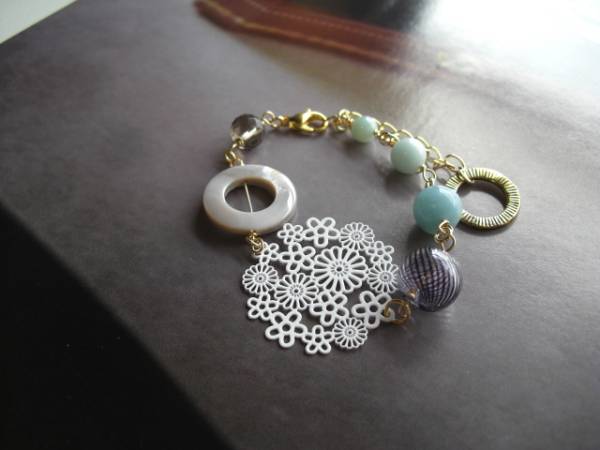ロゼッタの宝石箱・・シリーズです♪ベネチアの記憶・・神秘的なアマゾナイトやスモーキークォーツのブレスレットです♪ブルーグレーのアマゾナイトにスモーキークォーツや繊細な吹宙ガラスビーズやレース模様の透かしチャームやグレーシェルのデザインリングを合わせて儚げな表情です♪アマゾナイトは6ミリ、8ミリ、10ミリの丸玉、スモーキークォーツは8ミリのラウンドカット、吹きガラスは12ミリのラウンド、レース模様の透かしチャームは30ミリ位です♪長さは全長23センチ位で調節自由です♪お揃いのネックレスも出品しています♪シンプルで長く着けられるデザインを考えて作りました♪ハンドメイドをご理解頂いてノークレーム、ノーリターンでお願いします♪