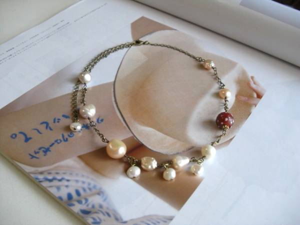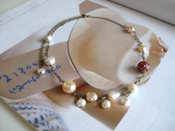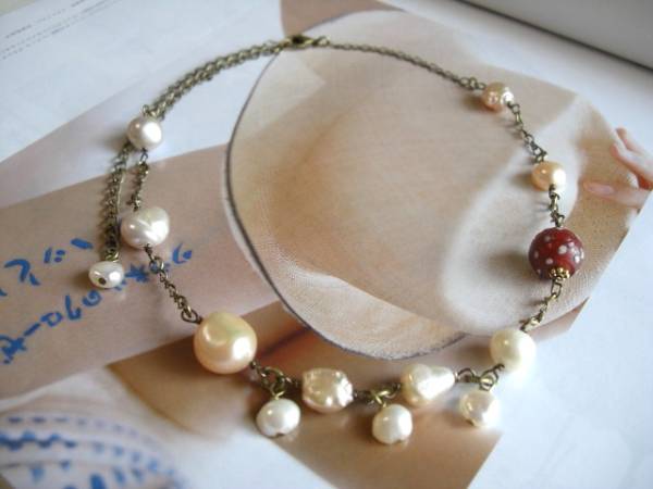 ビター・ガール・・シリーズです♪パールの物語・・ふんわりやさしい淡水パールのネックレスです♪淡いピンクやオフ・ホワイトのバロックやポテトの淡水パールにアンティークのとんぼ玉を合わせてアンティークモダンな雰囲気です♪8ミリから12ミリ位のバロックやポテトの淡水パールに12ミリ位の深い赤のドットのとんぼ玉を合わせました♪長さは40センチ+アジャスター10センチで最長50センチ位です♪お揃いのネックレスやブレスレットも出品しています♪シンプルで飽きのこないいつまでも着けられるデザインを考えて作りました!ハンドメイドをご理解頂いてノークレーム、ノーリターンでお願いします
