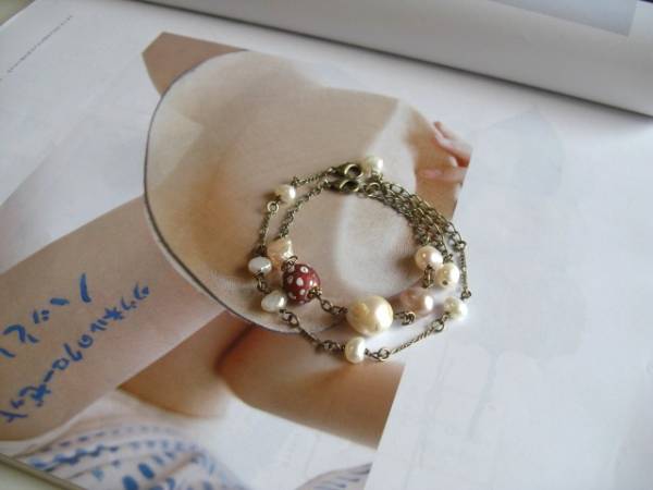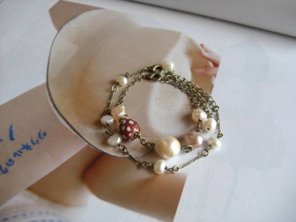 ビター・ガール・・シリーズです♪パールの物語・・ふんわりやさしい淡水パールのブレスレット2本セットです♪淡いピンクやオフ・ホワイトのバロックやポテトの淡水パールにアンティークのとんぼ玉を合わせてアンティークモダンな雰囲気です♪8ミリから12ミリ位のバロックやポテトの淡水パールには12ミリ位の深い赤のドットのとんぼ玉を合わせました♪長さは16センチ+アジャスター6センチで最長22センチ位です♪6×8ミリ位のバロックの淡水パールは華奢なチェーンで紡ぎました♪長さは16センチ+アジャスター6センチで最長22センチ位です♪それぞれ単品やネックレスも出品しています♪シンプルで飽きのこないいつまでも着けられるデザインを考えて作りました!ハンドメイドをご理解頂いてノークレーム、ノーリターンでお願いします