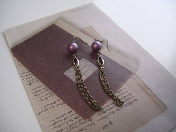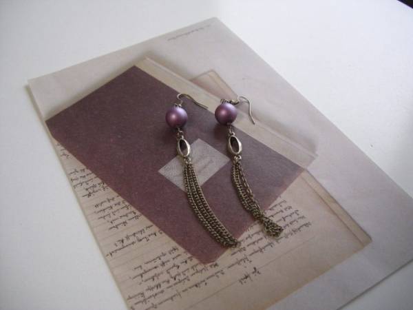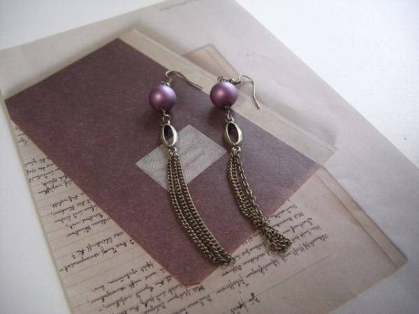 アリスの時間・・シリーズです♪ヴィンテージ・スタイル・・ビロードのような光沢のガラスパールのピアスです♪デザインチェーンを合わせてアンティーク・モダンしています♪マットなダークパープルのガラスパールは10ミリです♪長さは全長11センチ位です♪イヤリングにも変更出来ます♪お揃いのネックレスやブレスレットも出品しています♪シンプルで長く着けられるデザインを考えて作りました!ハンドメイドをご理解頂いてノークレーム、ノーリターンでお願いします