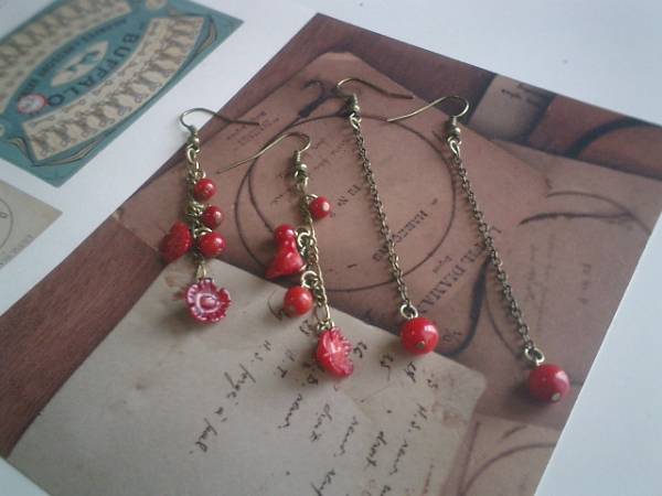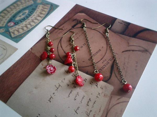 ロマンチックを紡いで・・シリーズです♪深い赤のお花・・シックな赤の珊瑚とお花のピアスです♪デザイン違いのペア2組です♪4ミリ、6ミリ、8ミリの丸玉の珊瑚に8ミリから11ミリ位までの珊瑚のお花を合わせて可憐な表情です♪長さは左のペアが6センチ、右のペアが8センチです♪イヤリングにも変更出来ます♪お揃いのネックレスやブレスレットも出品しています♪シンプルで飽きのこないいつまでも着けられるデザインを考えて作りました!ハンドメイドをご理解頂いてノークレーム、ノーリターンでお願いします