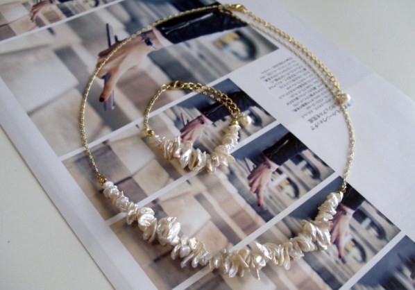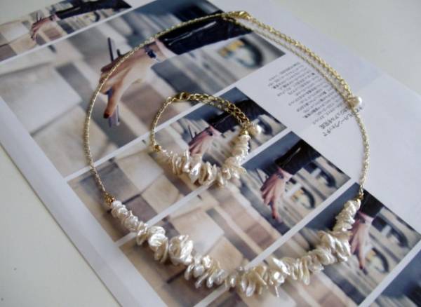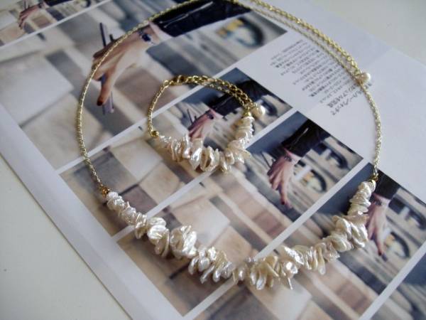 女の子らしさを+して・・シリーズです♪永遠のパール・・可憐な淡水パールのネックレス、ブレスレットの2点セットです♪オフホワイトの芥子パールのチップは7ミリから18ミリ位です♪ふんわりやさしい白が大人のロマンチックしています♪ネックレスの長さは55センチ+アジャスター10センチで最長65センチ位です♪ブレスレットは16センチ+アジャスター6センチで最長22センチ位です♪それぞれ単品やピアスも出品しています♪♪シンプルで飽きのこないいつまでも着けられるデザインを考えて作りました♪ハンドメイドをご理解頂いてノークレーム、ノーリターンでお願いします
