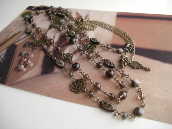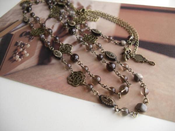 ネオ・ロマンチック・・シリーズです♪モノトーンの薔薇・・繊細なスモーキークォーツのネックレス2点セットです♪グレイオニキスやデザイン樹脂や薔薇のチャームを合わせてアンティークな表情です♪長い方のネックレスは6ミリの丸玉のスモーキークォーツに7ミリから16ミリ位までのグレイオニキスやデザイン樹脂や薔薇のチャームを合わせました♪長さは全長102センチ位で調節自由です♪2連にされても素敵です♪短い方のネックレスは6ミリ、8ミリの丸玉のスモーキークォーツに薔薇のチャームを合わせました♪長さは全長82センチ位で調節自由です♪それぞれ単品やブレスレットも出品しています♪シンプルで飽きのこないいつまでも着けられるデザインを考えて作りました!ハンドメイドをご理解頂いてノークレーム、ノーリターンでお願いします