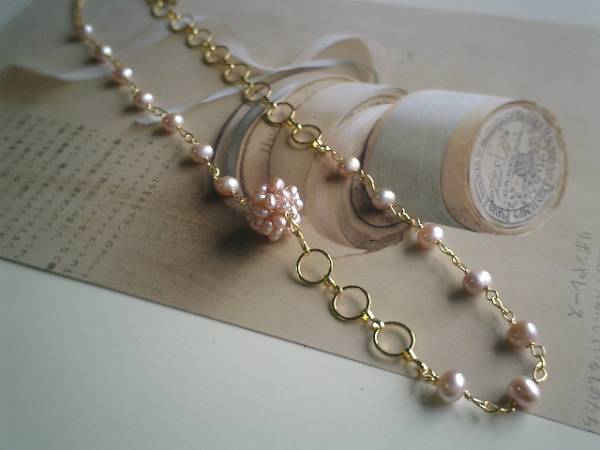 クレアの衣装箱・・シリーズです♪パール・レッスンⅡ・・ふんわりやさしいベージュ・ピンクの淡水パールのネックレスです♪同じお色のパール玉やデザインリング、デザインチェーンを合わせてロマンチックな表情です♪淡水パールは8ミリ位、パール玉は18ミリ位です♪長さは全長88センチ位で調節自由です♪お揃いのブレスレットも出品しています♪シンプルで長く着けていただけるデザインを考えて作りました!ハンドメイドをご理解頂いてノークレーム、ノーリターンでお願いします