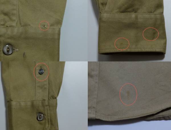 | コンディション | 右袖に2ミリくらいの小穴(写真3枚目左上)・右袖ボタンが1つだけ違うもの(写真3枚目左下)・左袖カフス部分やスソ部分などにシミ(写真3枚目右側)、などのダメージが有ります。それぞれ予めご了承下さい。その他全体的には着用感は多少ありますが、着用に支障の有るダメージ等は無く、まずまず良好だと思います。中古に理解の有る方のみ入札して下さい。 |