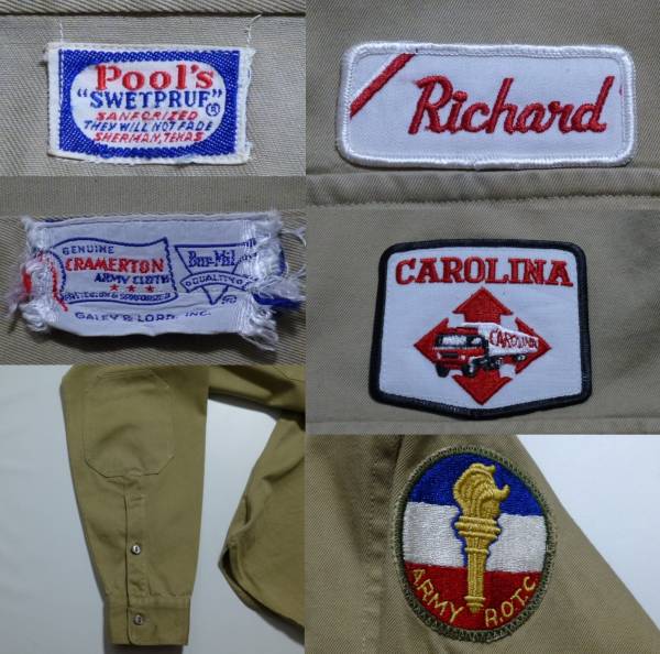 | コメント | 50年代~60年代頃の物と思われるワークシャツです。エリは大きめなレギュラーカラー、ポケットは両ムネにフラップ付きのものが付いています。ボタンは猫目ボタン、両サイドのスソ部分にマチが付いています。エルボーパッチ付きです。両ムネと左袖にワッペンが付いています。 |
