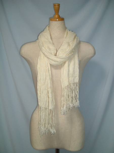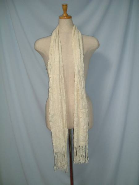 ・生成り色です。実物とは、多少色が違って見える場合があります。 ・新品ではありません、使用感が多少あります。細かい点が気になる方はご遠慮ください。 ・サイズは、幅28 丈164 +フリンジ13㎝ くらいとなっております。 ・誤差はあると思いますが、ご了承ください。 ・素材は、表示がありません、ポリエステル系のような感じです。伸縮性があります。 |