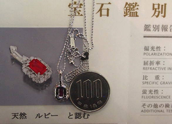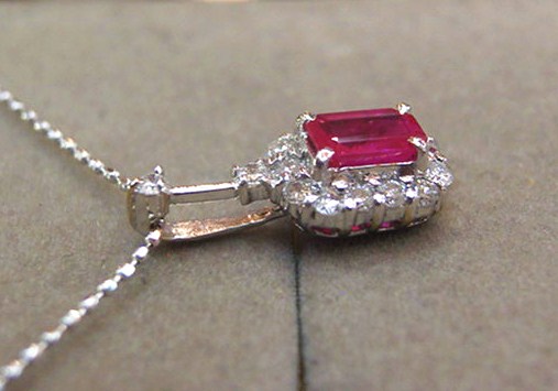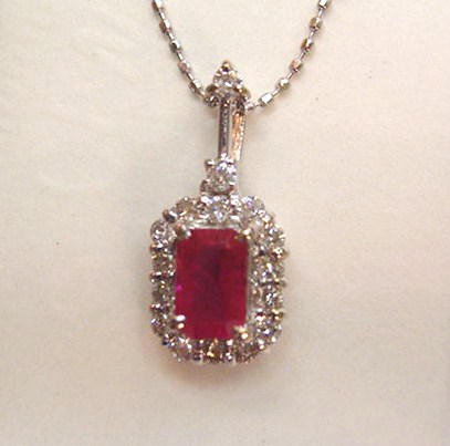 ♪輝きの良い、上質な【天然ダイヤモンド:0.27c】を縁取りした【K18WG】製ペンダント枠の中央に、上質で色の良い、長方形エメラルドカットの【天然ルビー:0.66c】を留めた、ペンダント!ルビーをルーペで見ると天然石特有の内包物はありますが色が最高ですのでまったく気になりません。あまり大きくないサイズでシンプル・上品・飽きの来ないデザインと造りですから、お仕事・会社でも使えます。ネックレスは、長さが45cmまで自由に変えられるタイプですから、どんなお洋服でも合わせられ便利な【Pt850】製・カットボール0.80mm巾です。取り外しも出来るので他のペンダントにも使えます。