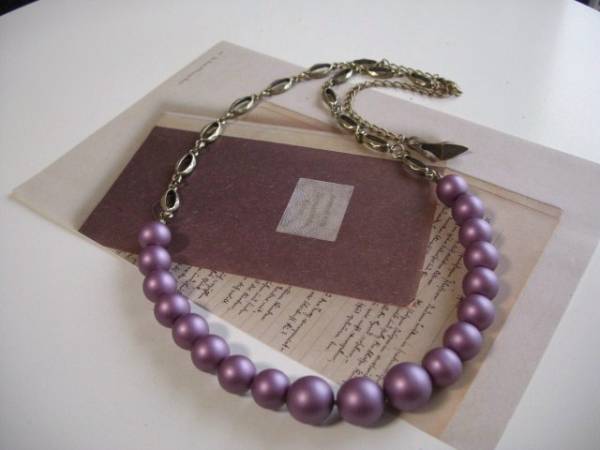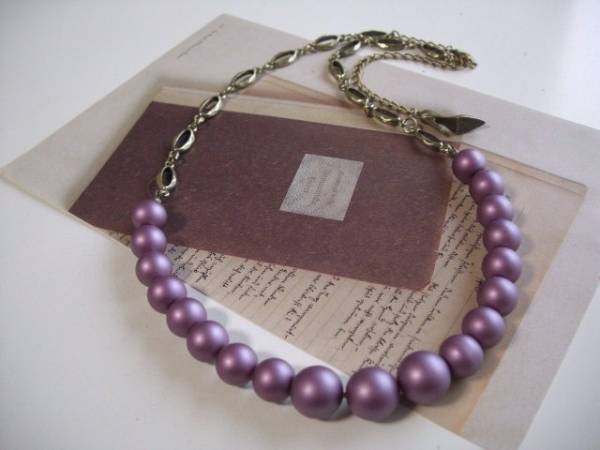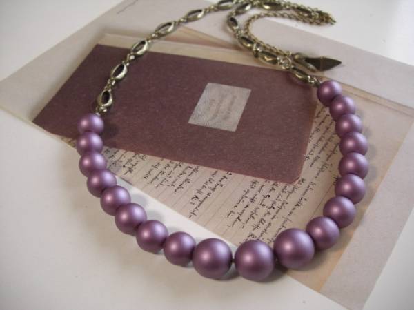 アリスの時間・・シリーズです♪ヴィンテージ・スタイル・・ビロードのような光沢のガラスパールのネックレスです♪デザインチェーンを合わせてアンティーク・モダンしています♪マットなダークパープルのガラスパールは10ミリ、12ミリのグラデーションです♪長さは全長72センチ位で調節自由です♪チョーカー風にされても素敵です♪お揃いのブレスレットやピアスも出品しています♪シンプルで長く着けられるデザインを考えて作りました!ハンドメイドをご理解頂いてノークレーム、ノーリターンでお願いします