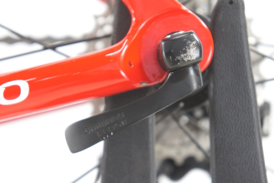右フォーク・左ブレーキレバー・フロントホイール・リアクイックリリースレバーにキズ、トップチューブ・ダウンチューブに小傷、シートポスト・サドルにスレ、前後タイヤ側面に劣化がございますが、その他小傷程度で使用感の少ない美品となります。