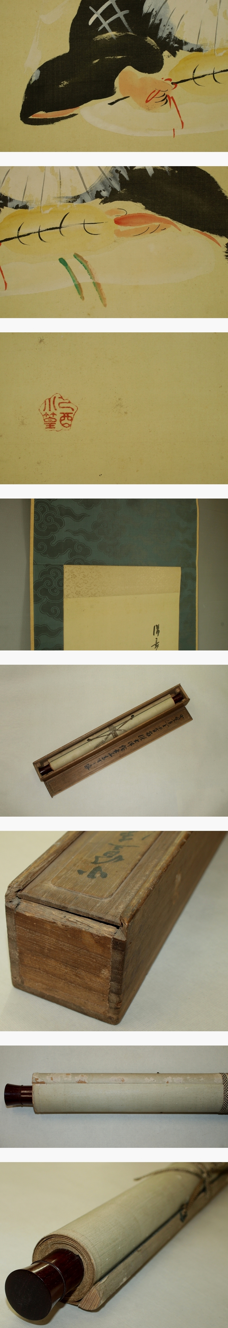 田能村小篁 たのむら-しょうこう(1879-1910) 明治時代の画家。 明治12年生まれ。祖父田能村直入と父小斎に文人画を学んだ。 明治43年5月27日死去。32歳。本名は直太郎。 本紙は、染み、汚れ、軽い皺、ヤケがあります。 表装は、染み、汚れ、皺、虫食い、破れ、ほつれ、軸紐に劣化、箱に破損があります。 【サイズ】 作品 横約36cm×縦約113.5cm 表装 横約51cm×縦約193cm |