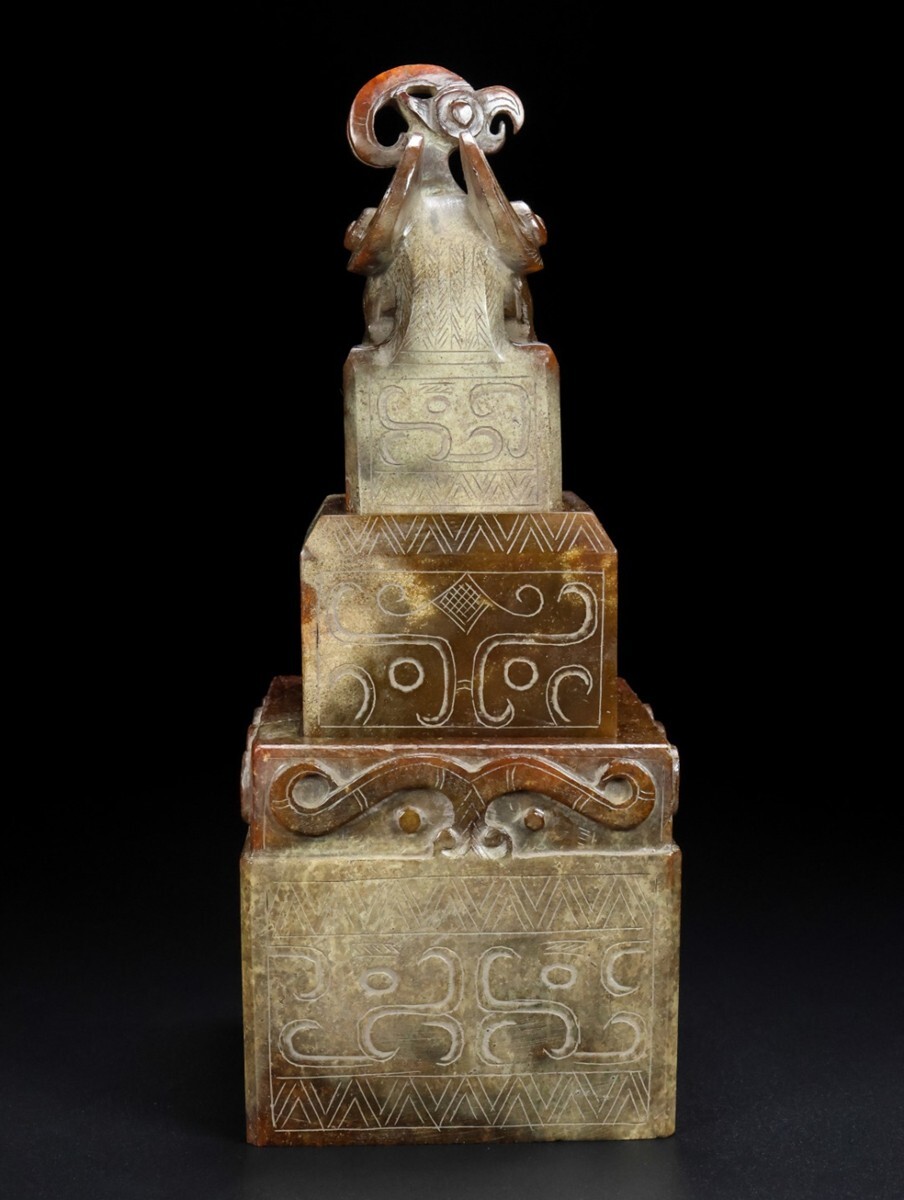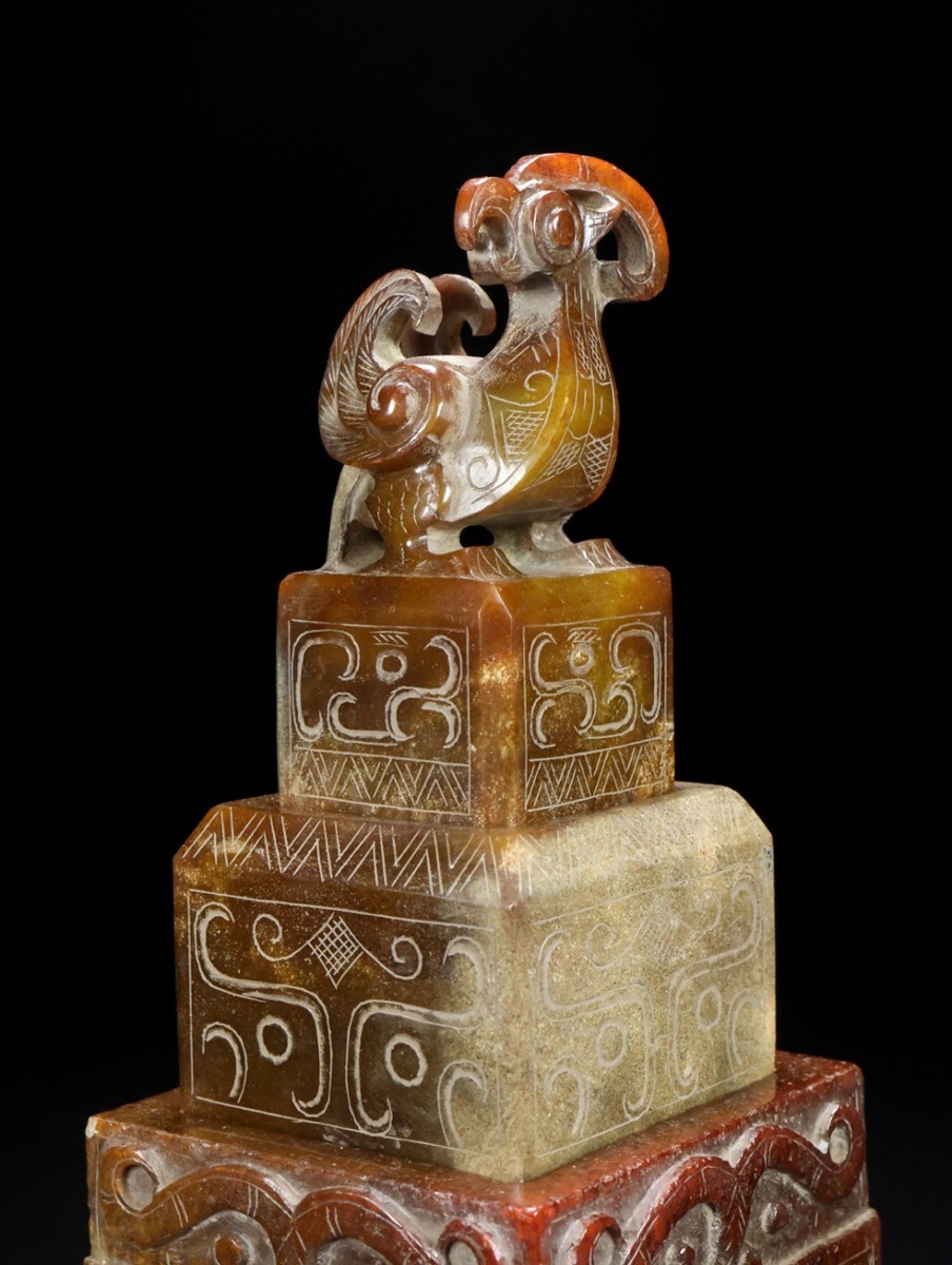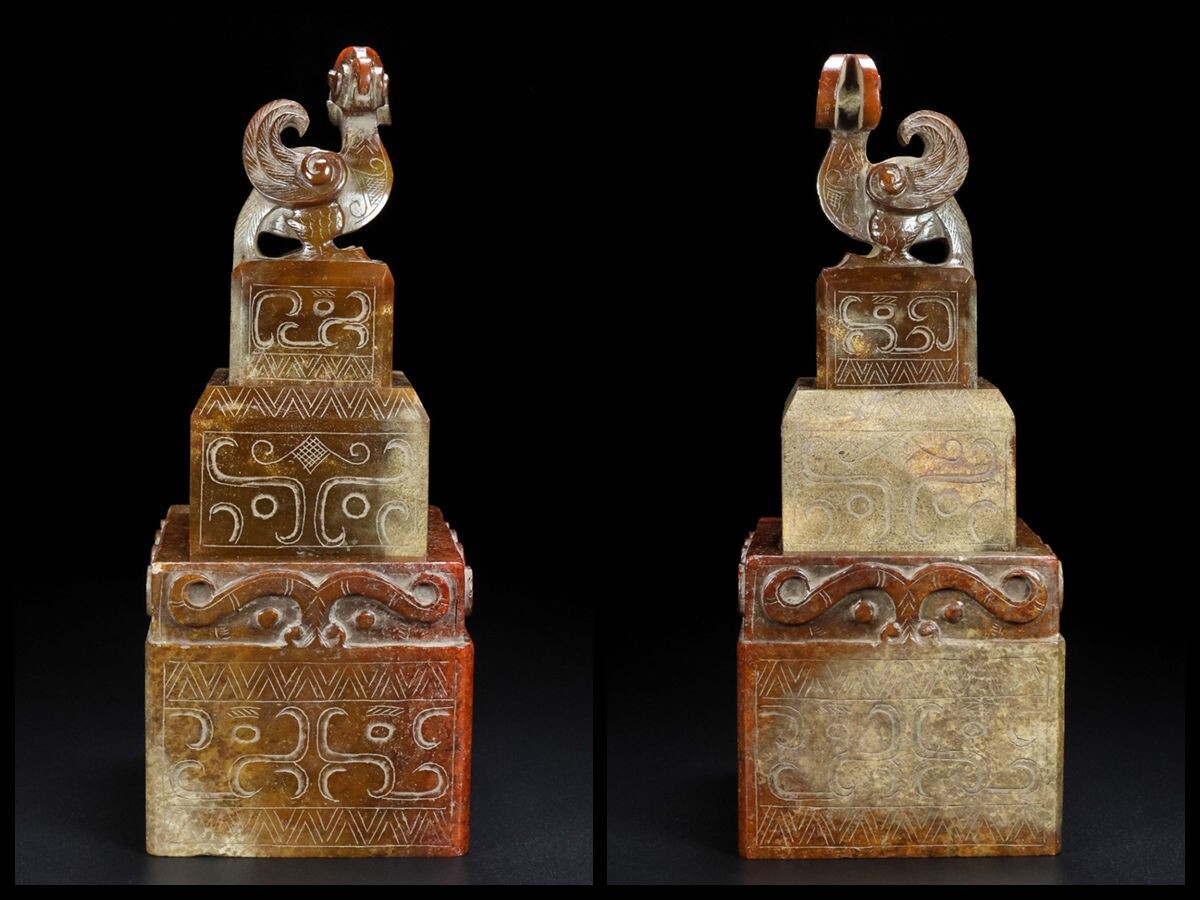 「戦國時期 和田玉 高古玉彫り 饕餮紋 鳳鳥印章」極細工 擺件 中国古賞物 古美術 旧蔵出
