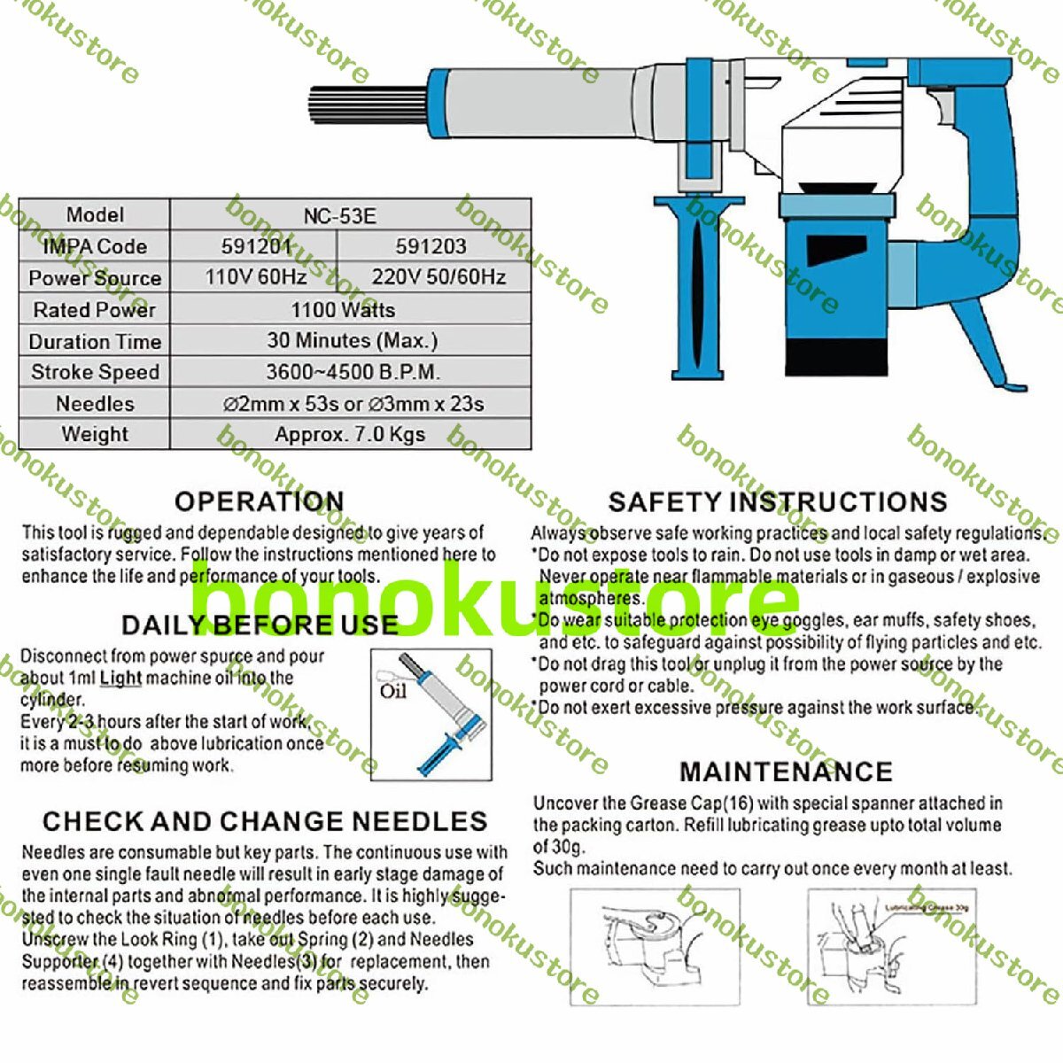 名称:電動サビ取り機 電圧:110V ~ 60Hz、220V ~ 50Hz モーター出力:1100W 無負荷運転速度(最大):3800回/分 最大使用時間:30分 適合針:φ2×180mm/φ3×180mm 本体重量(kg):6.5kg パッケージ内容: 電動サビ取り機 x 1 取扱説明書 x 1