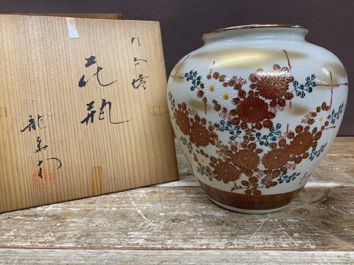 【YB-2690】九谷焼 龍仙 花器 花瓶 壺 金縁 色絵 花 高さ約20cm 口径約11cm インテリア 置物 共箱付 東京引取可【千円市場】