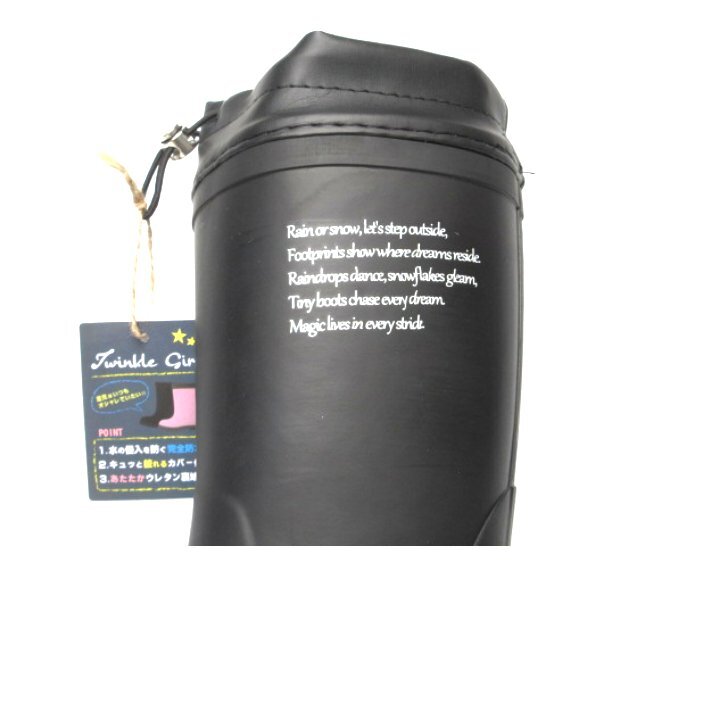 雨や雪が降るのが待ち遠しくなるTwinkle girlの長靴です!スパッツが付いているので、雪やゴミの進入を防ぎます。パッケージが手提げのキャリーバッグになるアイデアレイン。インナーライニングにはウレタンを使用。ボアライニングではございませんので通年お履きになれます。スパッツには反射材が付いているので夜間の視認性を高めます。インソールは取り外し式。