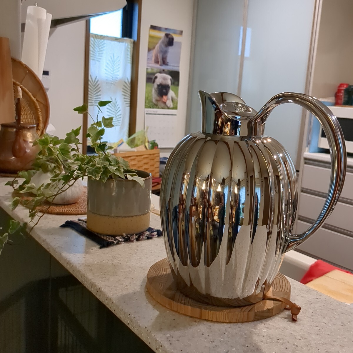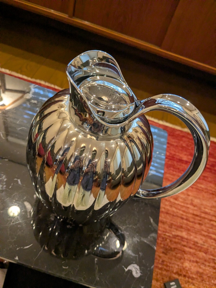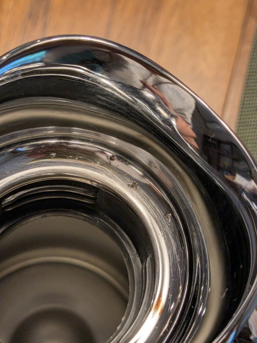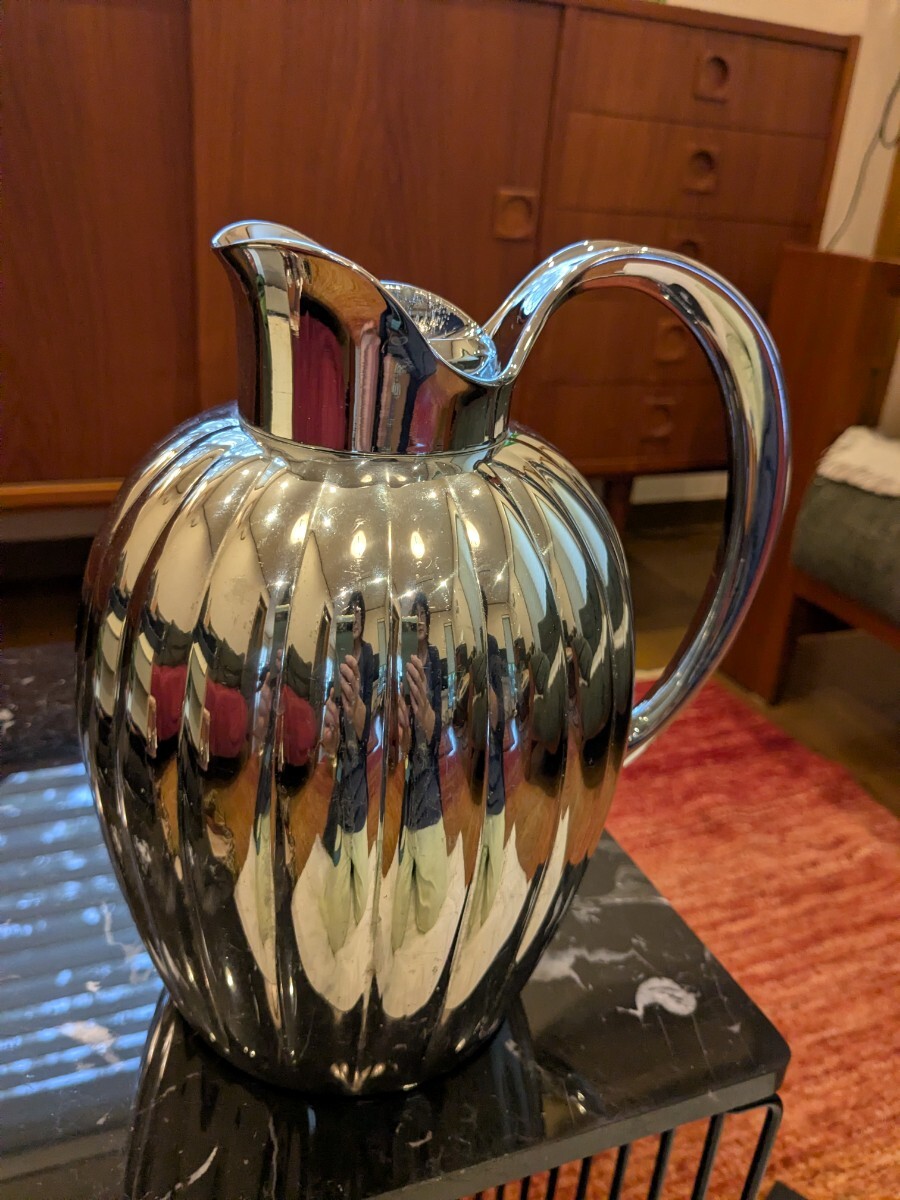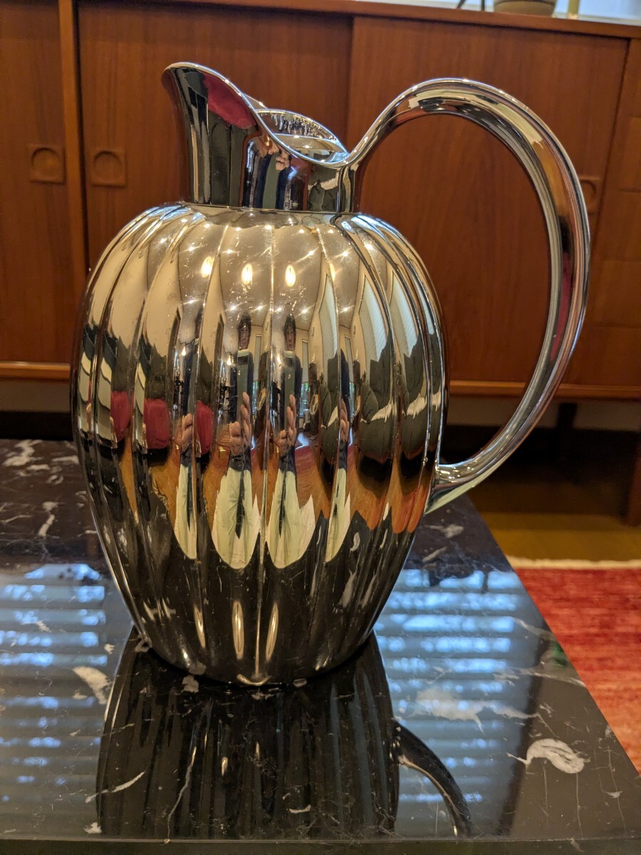 蓋と注ぎ口に傷があります。写真でご確認ください。本体に小キズはあるものの目立つものはありません。ジョージジェンセンらしい美しいサーモジャグです。保温力は長くは続きません。キッチンに飾ったり、多人数にお茶をサーブする時に使っていました。蓋のキズがありますので、ご理解のある方にご購入いただけますよう、お値段は低く設定しています。よろしくお願いいたします。
