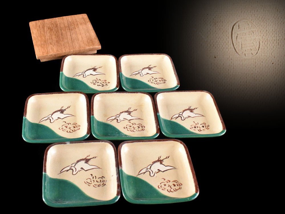 | 商品名 | 【雲】某収集家買取品 萬古 織部写 鶴絵付四方皿 角皿 7客 直径9cm 箱付 古美術品(小皿懐石料理道具)BY5474 LTfde |