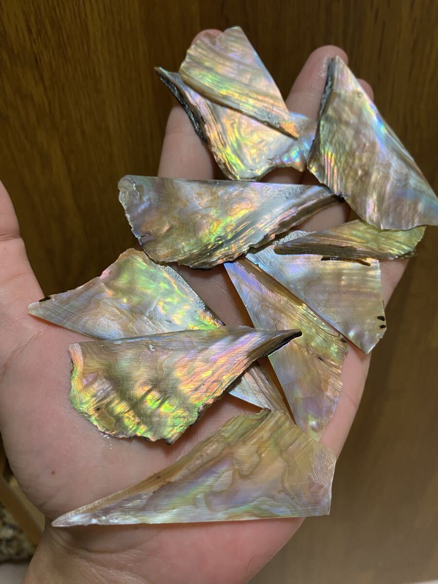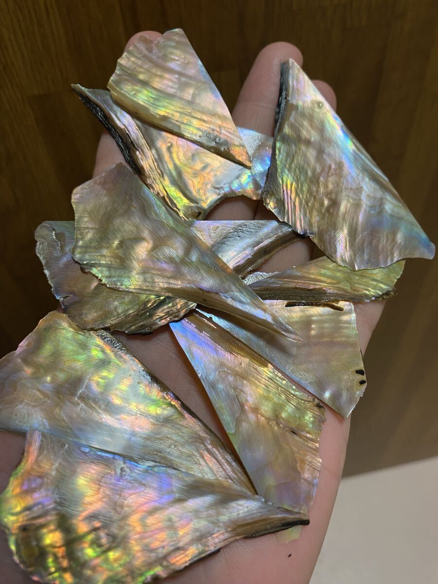 * 活かし貝殻を小さなパーツに切り分け、磨いて平らに仕上げてます