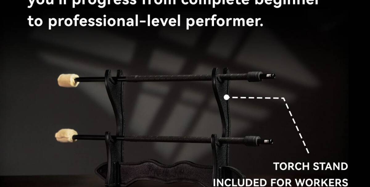 また、付属のトーチはこのファイヤーパフォーマンスのために設計された特製の物となっております。重量バランスや耐久性、グリップ性において使いやすさと安全性を追求したデザインです。専用のトーチスタンドも付属し、不慮の事故を可能な限り無くすよう配慮されています。