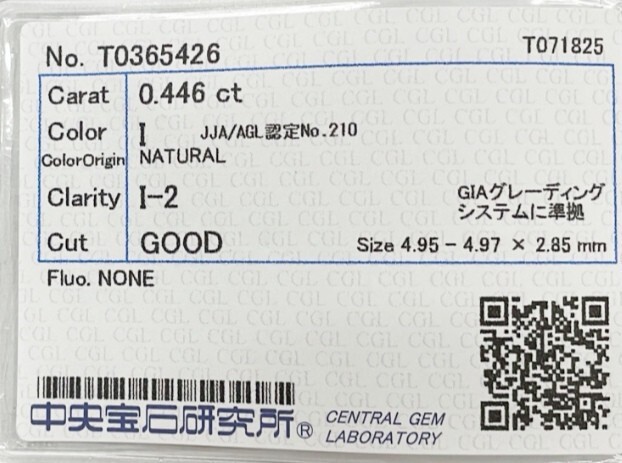 D0.446ct I I2 GOOD 天然ダイヤモンドルース 裸石 NATURAL DIAMOND sorting 中央宝石研究所ソーティング付き