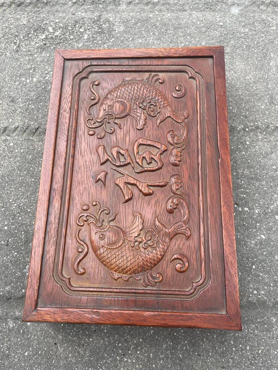 【超珍館蔵】花梨木製 細密彫 雙魚送福 功夫茶盤 壺承 置物 賞物 古賞物 古美術品 稀少珍蔵品