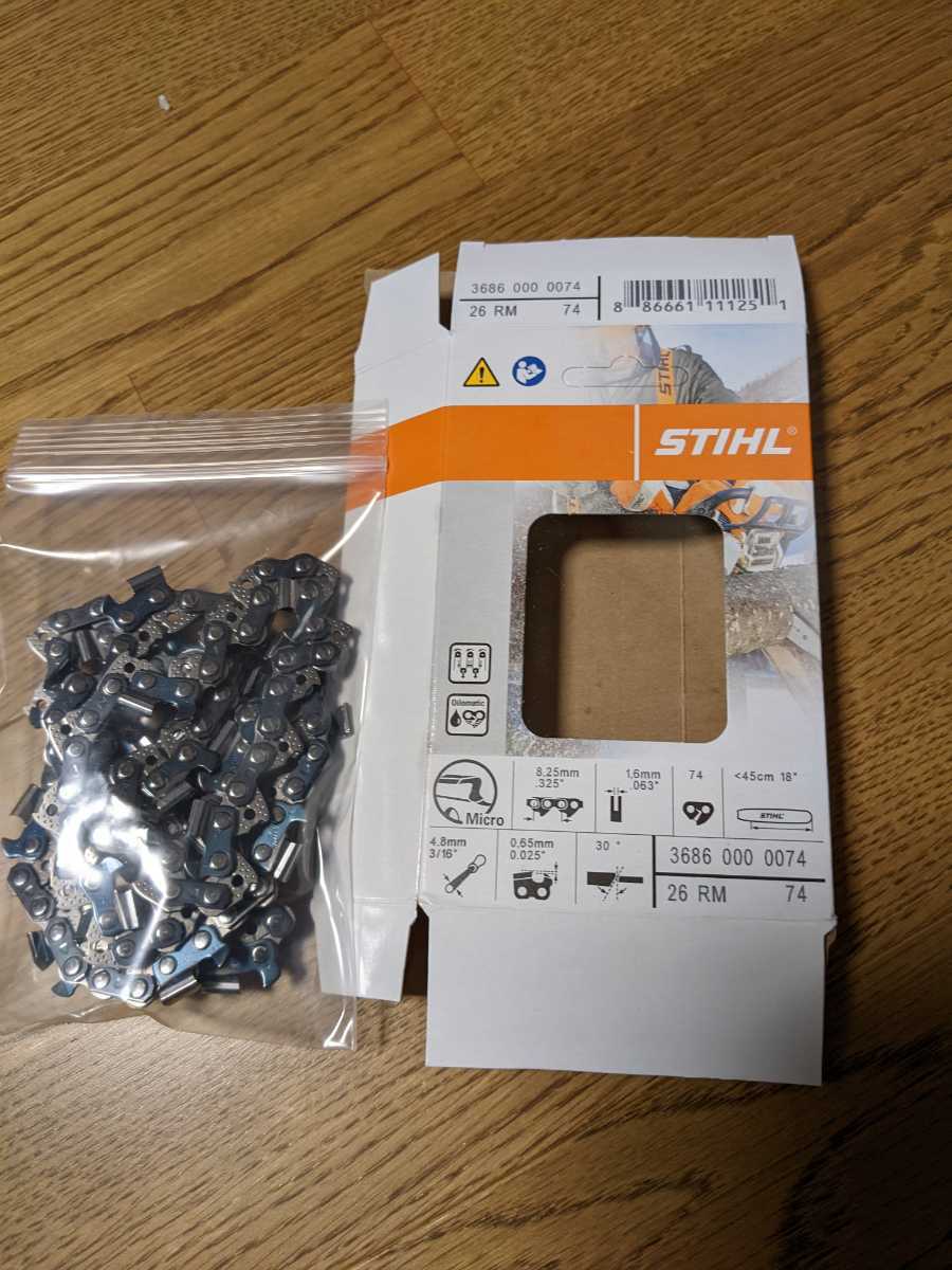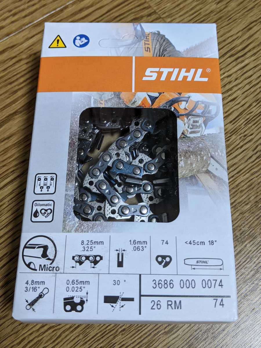 スチールチェーン ラピッドマイクロチェーン (26RM-74).325"ゲージ1.6mmを1本の出品です。※スチール純正新品1本。 使用機種:MS240 MS260 MS261 MS280 MS290などのスプロケットが.325ゲージが1.6mmの18インチバーで使用可能です。45㎝バー用。 ★発送 ネコポス ポストイン。時間指定不可。 厚さ、3cm迄の規定上(ネコポス)、箱を潰しての発送になります。 ★振込先 簡単決済のみ その他 ■写真を参考にしてください。 | ||