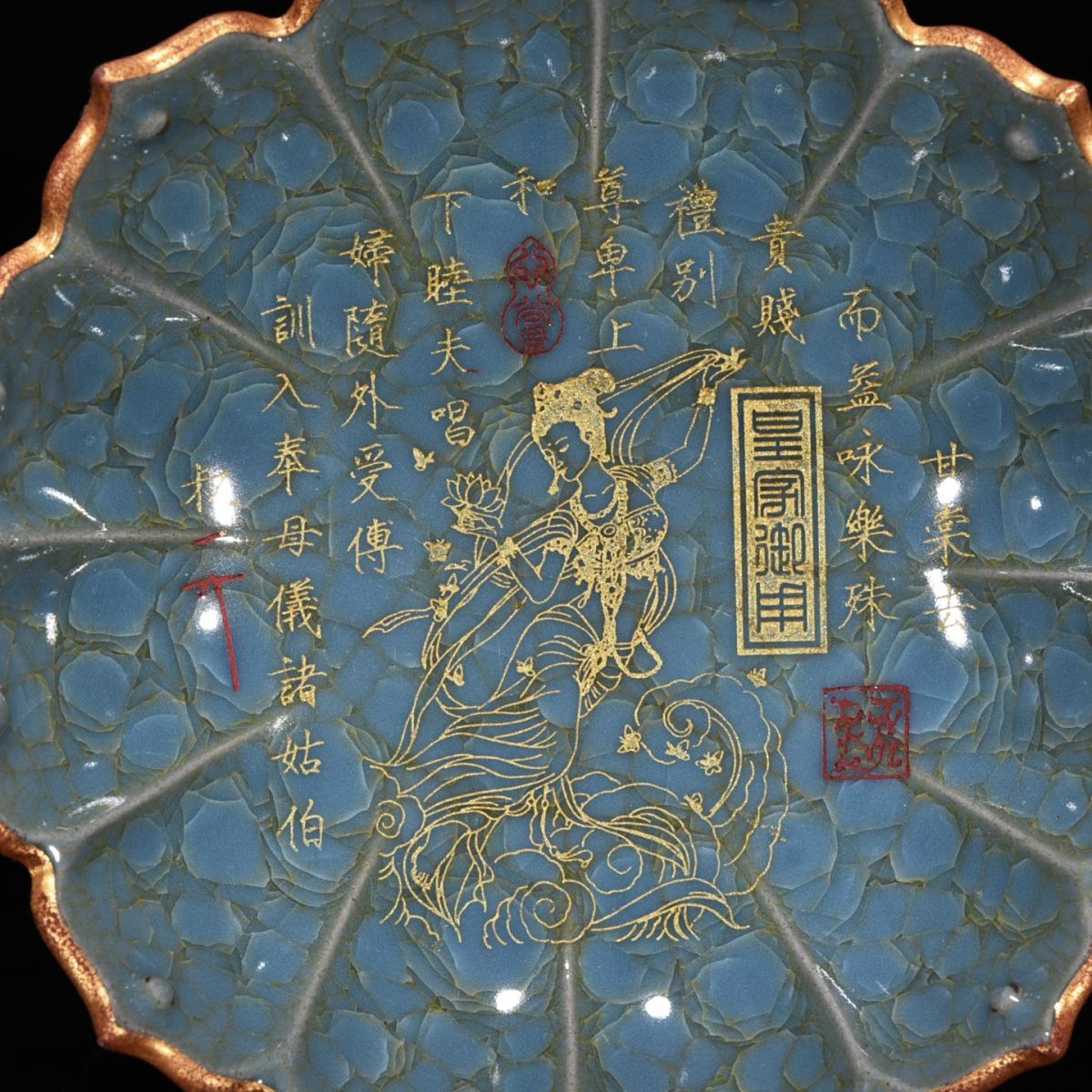 【永】宋時代 官窯 藍釉冰裂紋 金包口銘文塗金仕女洗 古陶磁器 陶芸 皿 中国陶瓷器 唐瓷 置物擺件 古美術品 古賞物 旧家蔵出 中国唐物