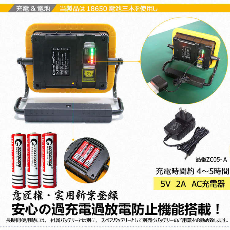 | セット内容 | 投光器本体、18650型充電池(品番:LDC-361A)*3本、AC充電器、取扱説明書、保証書 | ||