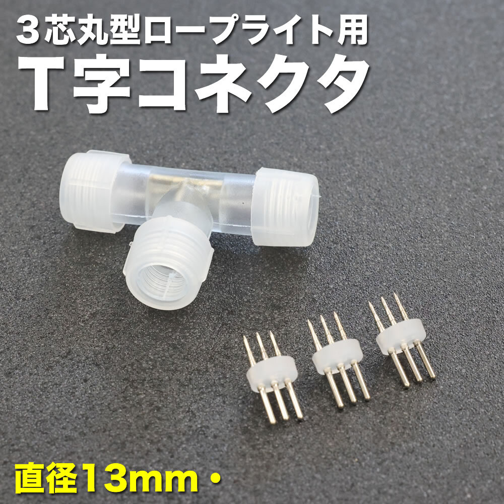 | 丸型・3芯丸型のLEDチューブライト3本をT字型に連結できるコネクタです。 1個単品での販売となります。コネクタピンをロープライトに接続した後、T字コネクタに直接差し込みします。1本のロープライトから2本に分岐させる用途に活用できます。2芯丸型ロープライトには対応しておりませんのでご注意ください。商品内容:T字コネクタ本体、コネクタピン3個対応:3芯丸型ロープライト 直径13mm※連結をされる際は総延長が50m以内になるようにしてご使用ください。 |