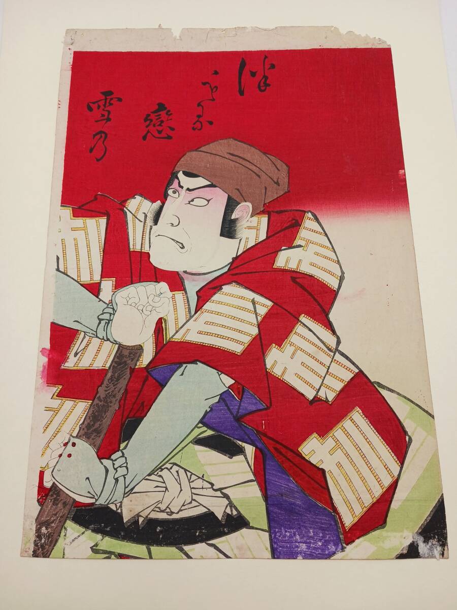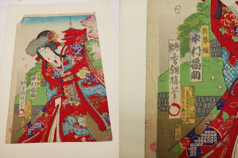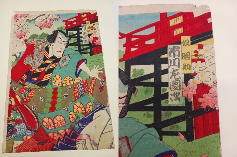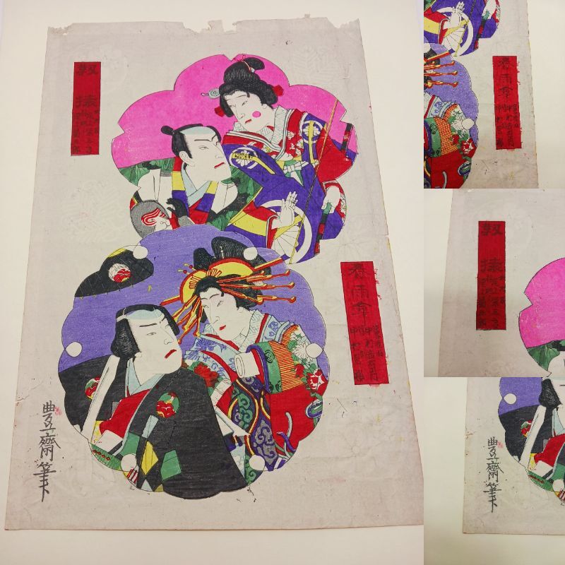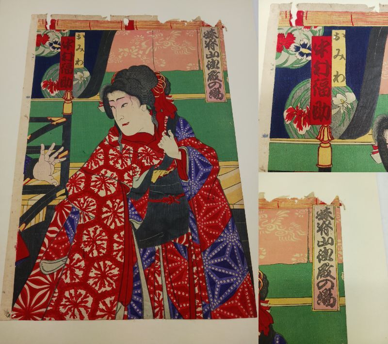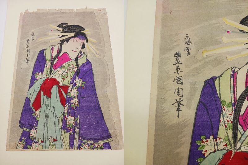 当方は浮世絵の専門家ではありませんので、詳細な作者や年代についてはお答えできかねますが、画像にて状態をご確認ください。