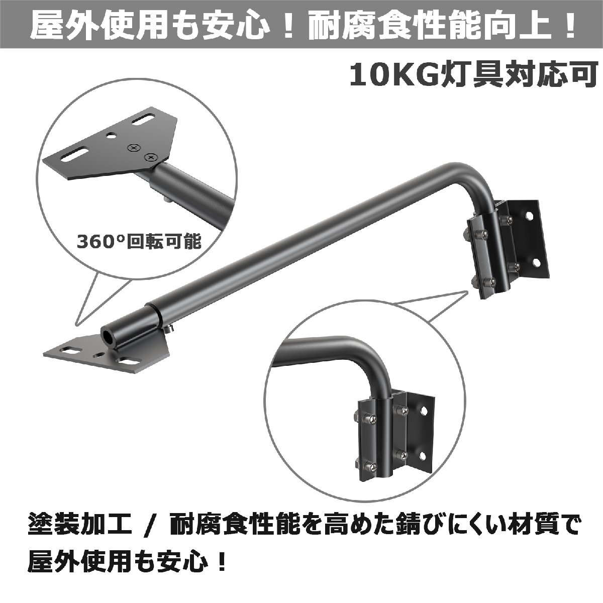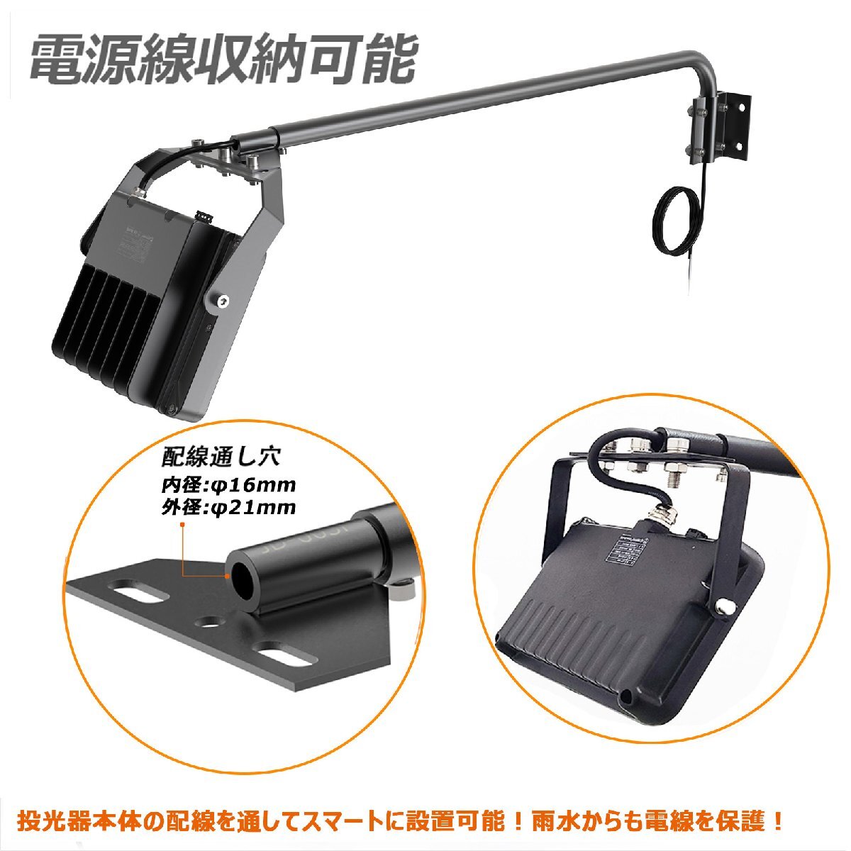 ★オススメポイント★ 投光器・看板照明用アームです。 取付ける灯具の質量は10kg迄で、また様々な方向で設置可能です。 静荷重試験による検証が実施済みです。 最大「風力階級12」相当の57m/s風速に耐えられますので、安心・安全に使用できます。 ※静荷重試験とは、一定荷重あるいは一定変形毎に加力を止め各部のひずみや変形の度合いを測定するものです。 優れた材質を採用 優れた鋳鉄材を採用し、高強度を実現しました。 さらに塗装加工で、耐腐食性能を高め、錆びにくいですので、屋外でのご利用にもおすすめです。 様々な設置方向適応可能です。 アームを様々な方向に設置できるため、施工条件に合わせた取付方法が選択できます。 電源線収納可能 アームの中に投光器の電源線を通し、電源コードをスッキリ収納できます。 ※灯具取付金具の直径はΦ20mmです。 様々なシチュエーションで使えます。 ・屋内外のサインボード、店舗の看板、広告看板、壁面看板、広告壁などの看板照明用。 ・展示会場・施設・建物の景観維持にもおススメです。 △ご注意△ 必ず垂直な壁面につりつけて使用してください。 特に灯具側が下がった状態で使用すると、灯具内に浸水してしまう可能性があります。 アームの施工は市販のワイヤーで補強してください。
