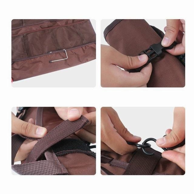 くるっと丸めて持ち運びも可能です。 丸め方も下から丸めてプラスチックのバックルとマジックテープで止めて最後に両サイドにあるフックをかけるだけです。