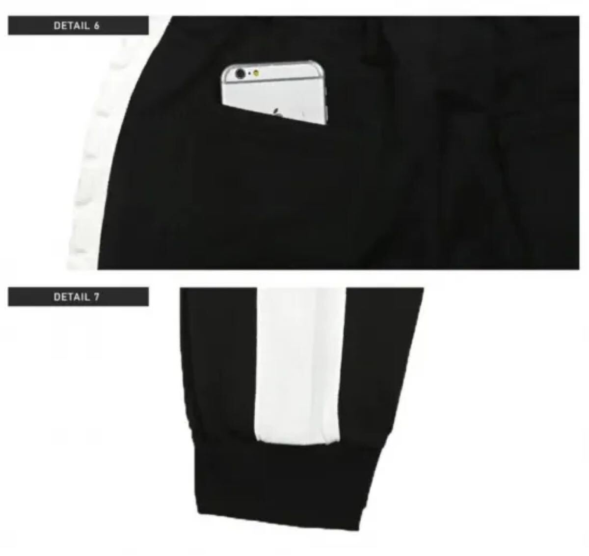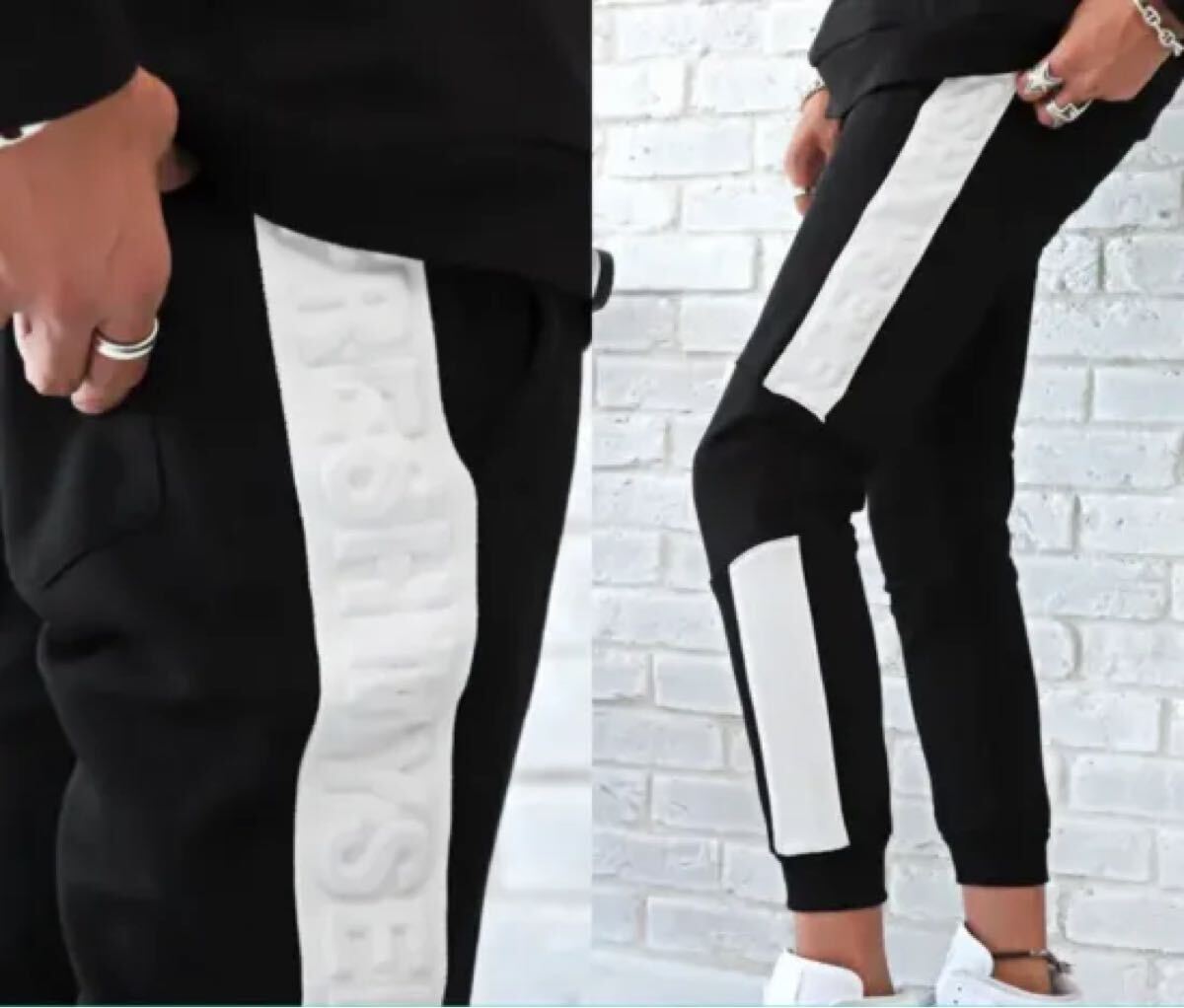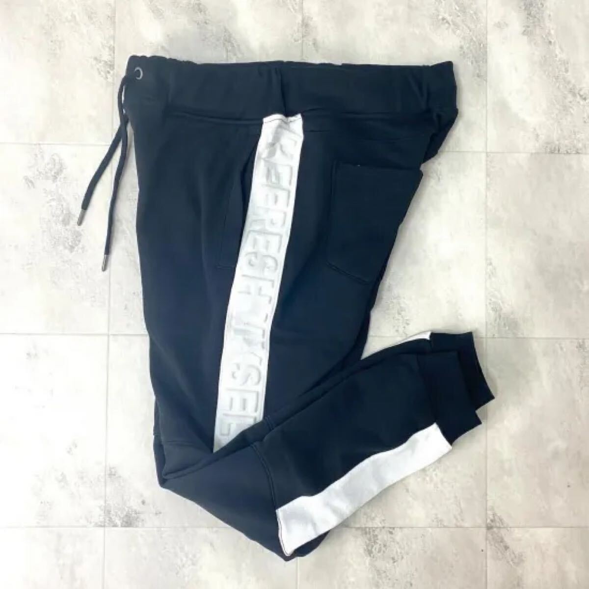 サイドのエンボスロゴ加工と配色ラインをアクセントに仕上げたジョガーパンツ。