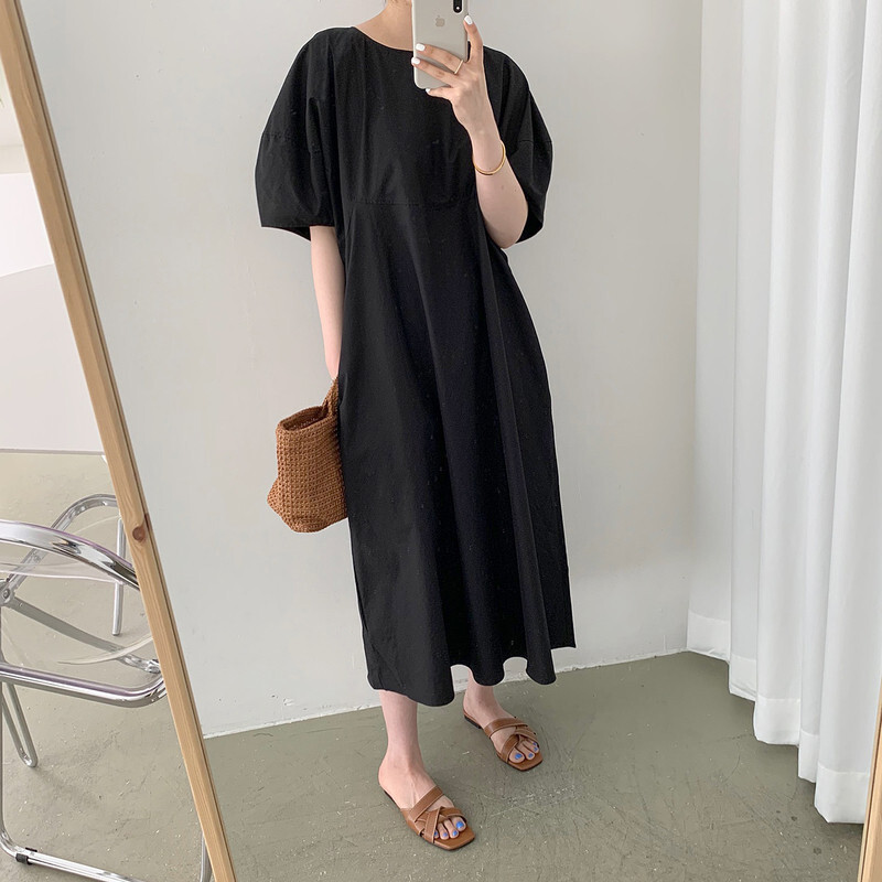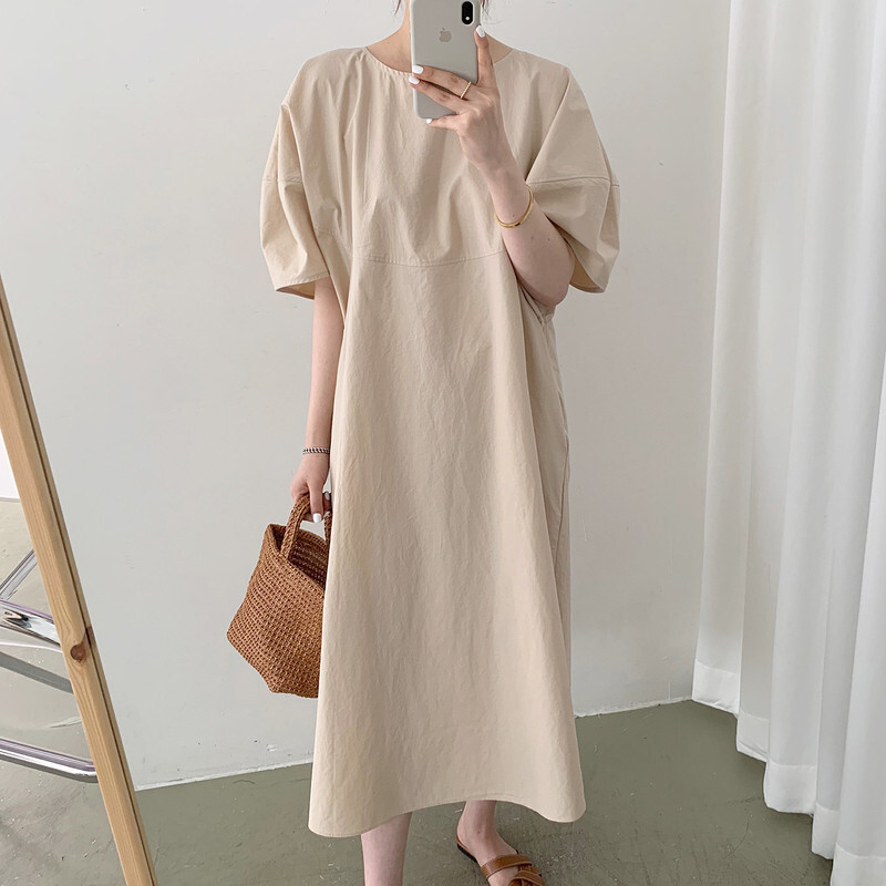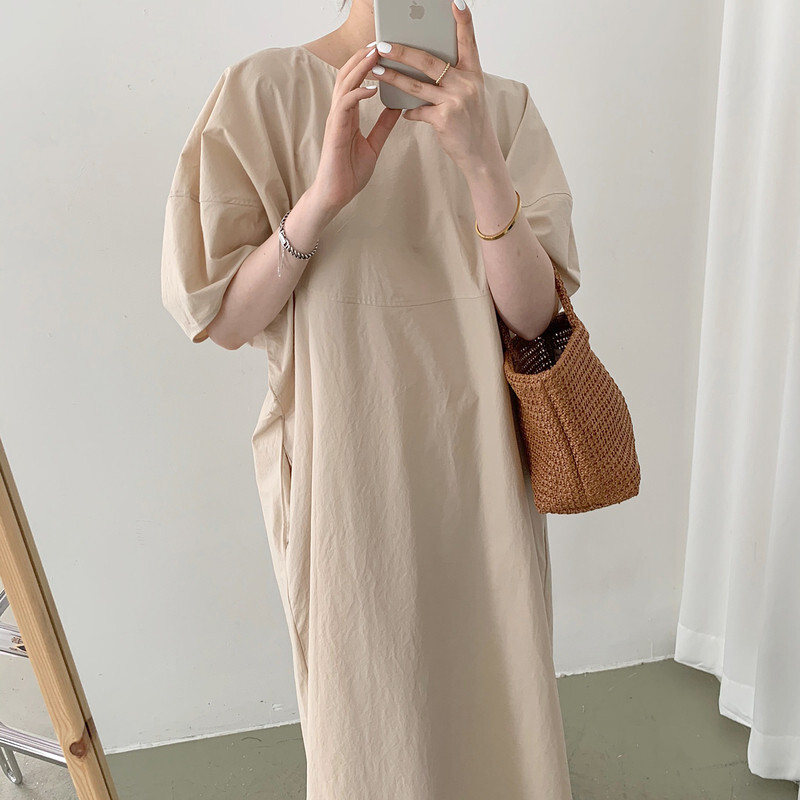 人気推薦オシャレカジュアル無地 ゆったり大きいサイズ 半袖マキシロ ングワンピース ベージュ