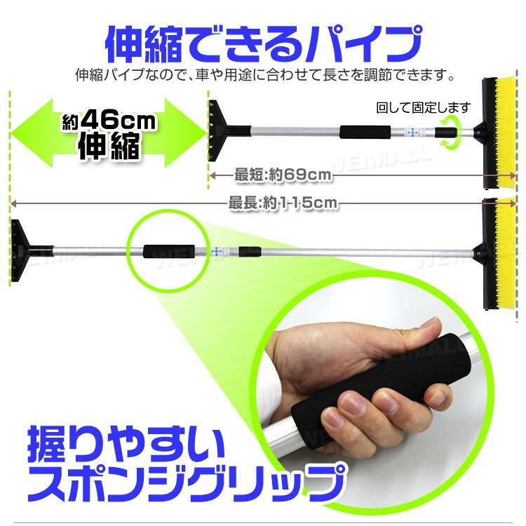 | 自動車の雪下ろしに、便利なスノーブラシです。 水切りワイパー付き! 握りやすく、手に心地よいスポンジグリップです。 ブラシ部は窓ガラスについた雪を払うのに便利 、ゴムワイパーは凍りついた雪などをこすったり解けた氷水を流します。 また、スクレイパーはタイヤ周辺や足回りの固く凍りついた雪や氷を砕きます。 伸縮式なので、車や用途に合わせて長さを調節できます。(約69cm~最大115cm) 【仕様】 サイズ(約):270×135×690~1150mm 重量(約):360g 材質:アルミニウム、PVC、ABS樹脂他 |