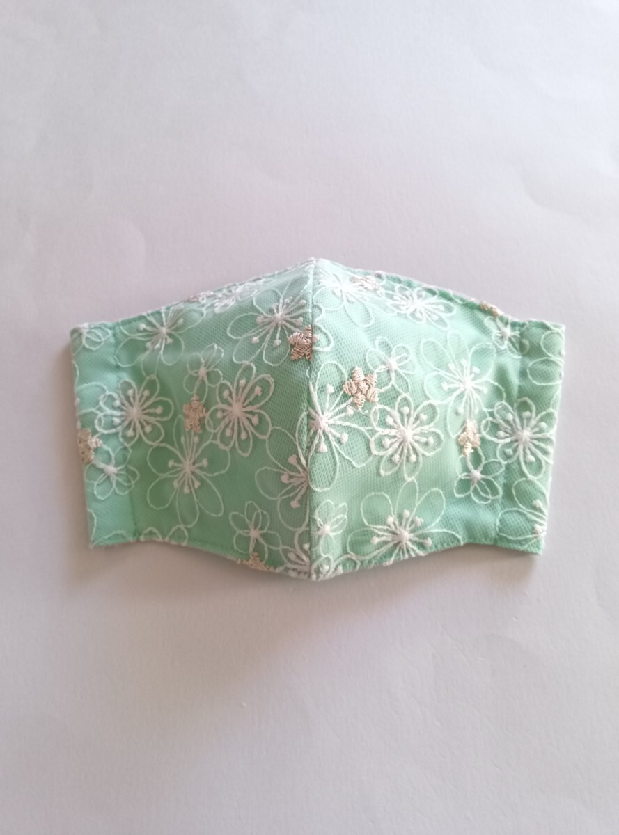 大人〜小学校高学年用立体マスク1枚入り/ミントグリーン(ゴールドのラメ糸入りレース使用)ハンドメイド★送料無料★