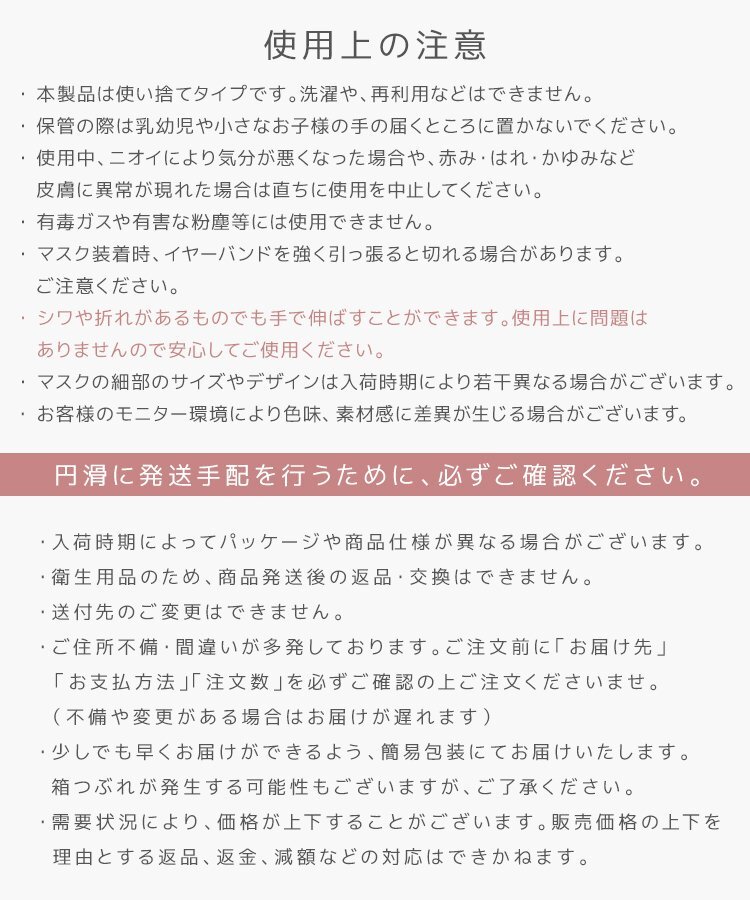 | 人気のジュエルフラップマスクシリーズ『3Dデイリースタイル』 360°きれいなシルエットで隙間なく輪郭にフィット! 着けた瞬間ひんやり気持ちいい接触冷感。 内側には不快感を軽減する、さらさら素材を採用♪ 【商品詳細】 ◆内容:3D立体マスク 20枚入(入荷時期により5枚ずつもしくは10枚ずつの包装) ◆カラー: ホワイト ◆サイズ(折りたたみ時) Lサイズ(約):幅117mm×高さ143mm ※詳細画像参照 ◆素材:ポリプロピレン不織布、耳ひも部分(ポリエステル) ◆生産国:中国 ◆保証期間:7日間 ※商品到着後7日以内の初期不良・破損のみご対応させていただきます。 |