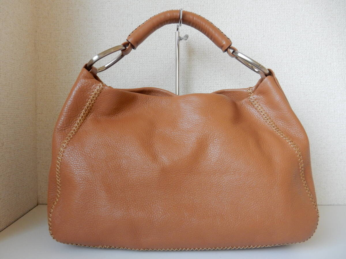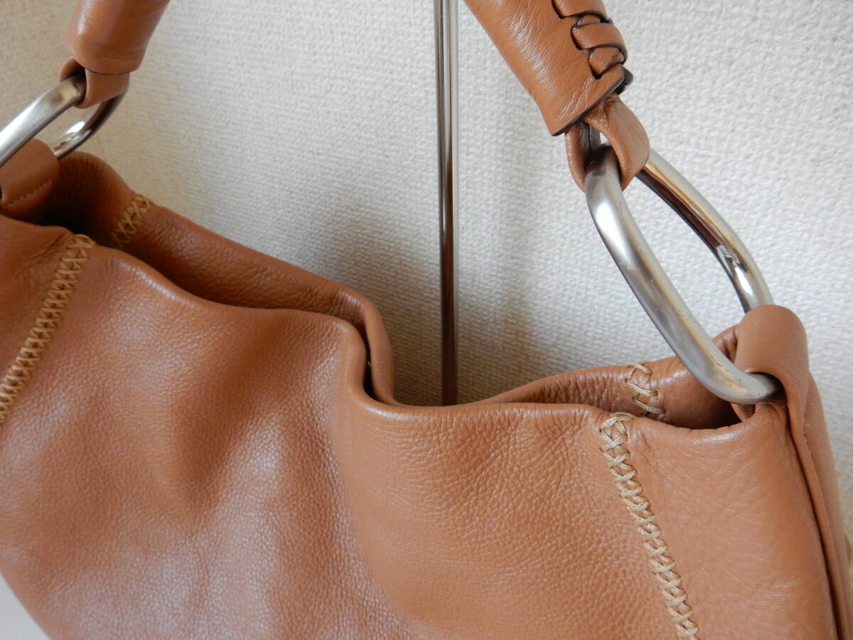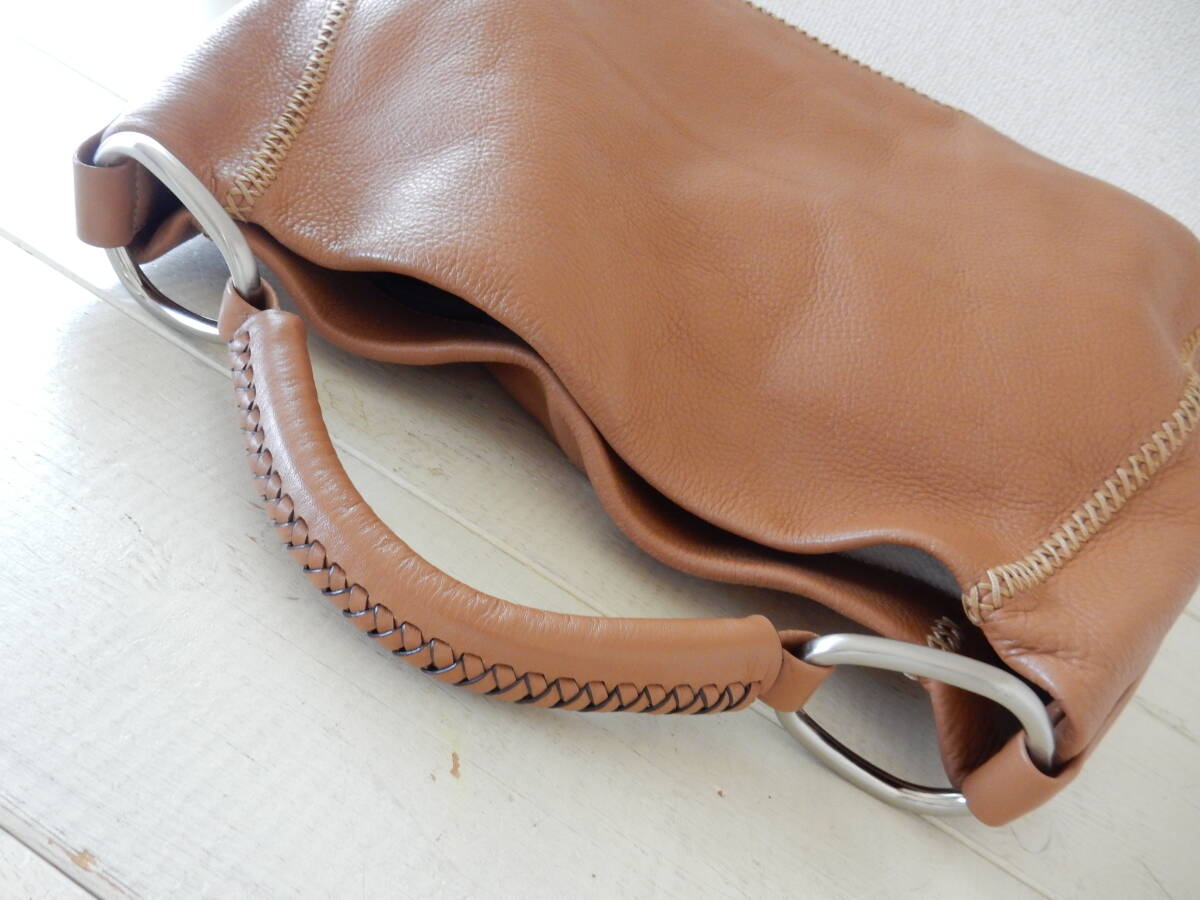 ハンドル根元のエッグリングがアクセントとなった本革ハンドバッグ。