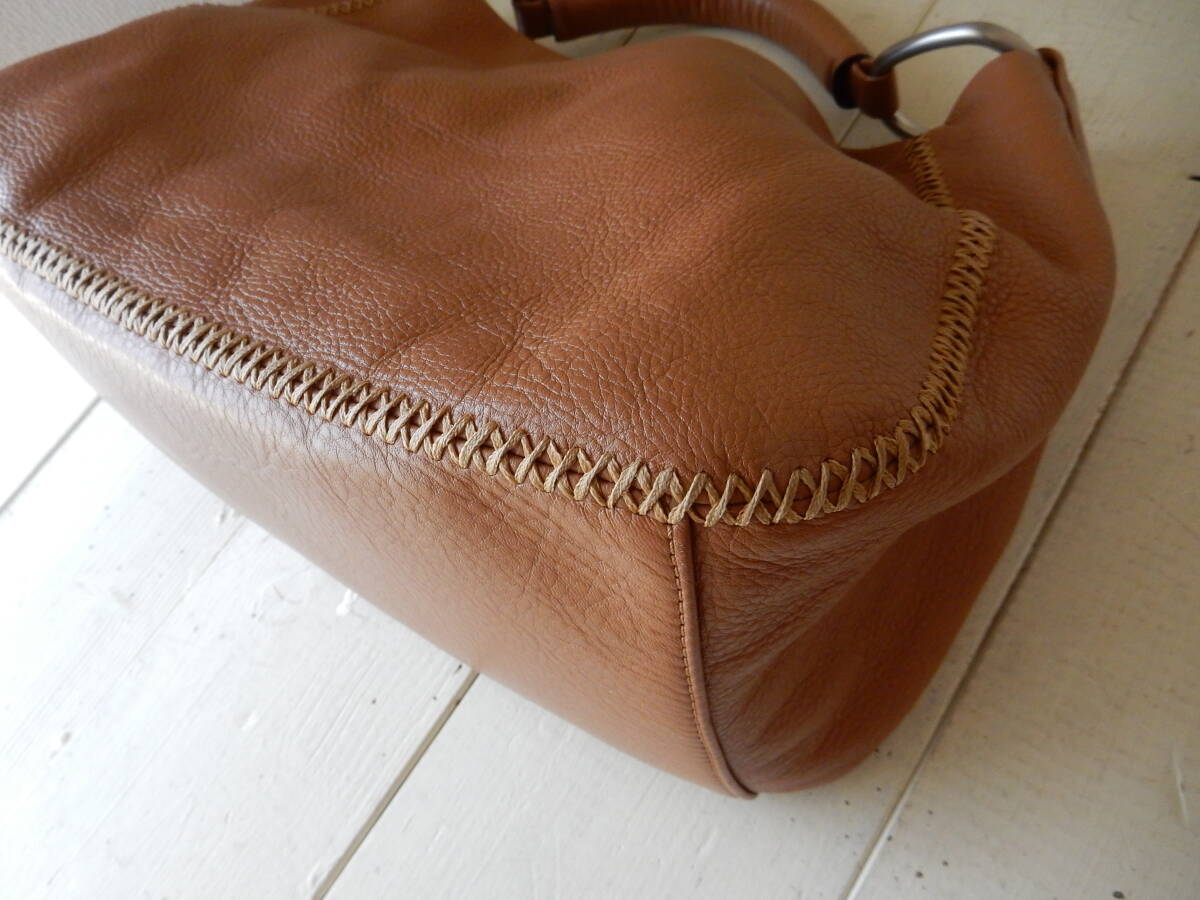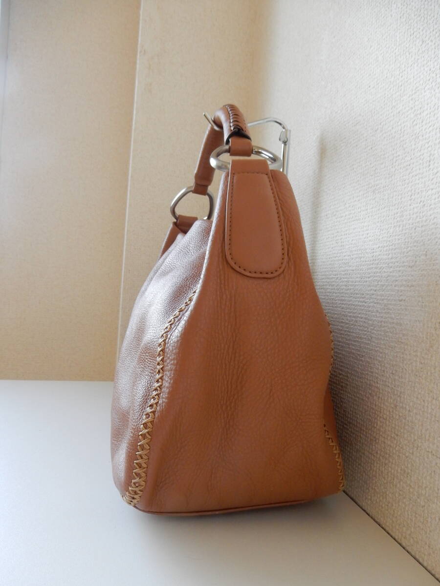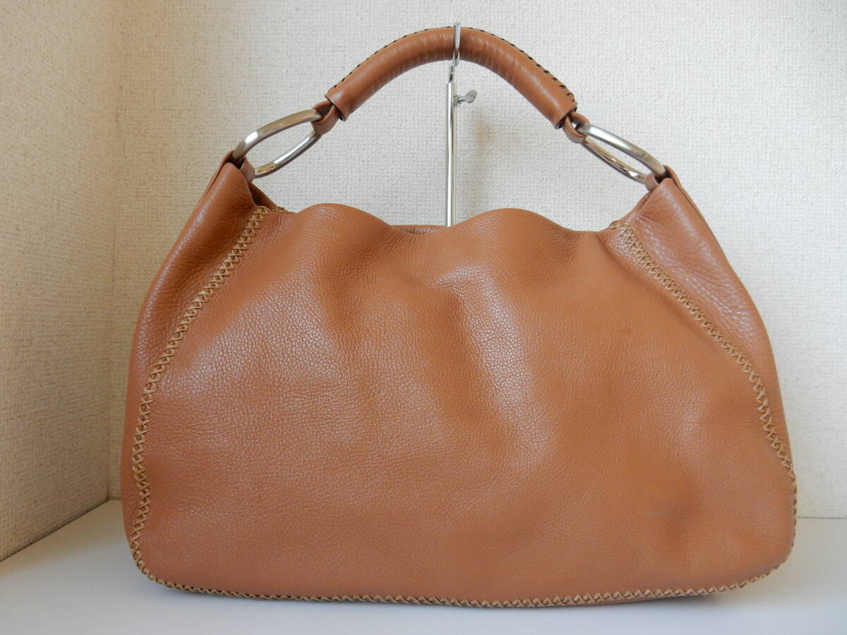 ハンドル根元のエッグリングがアクセントとなった本革ハンドバッグ。