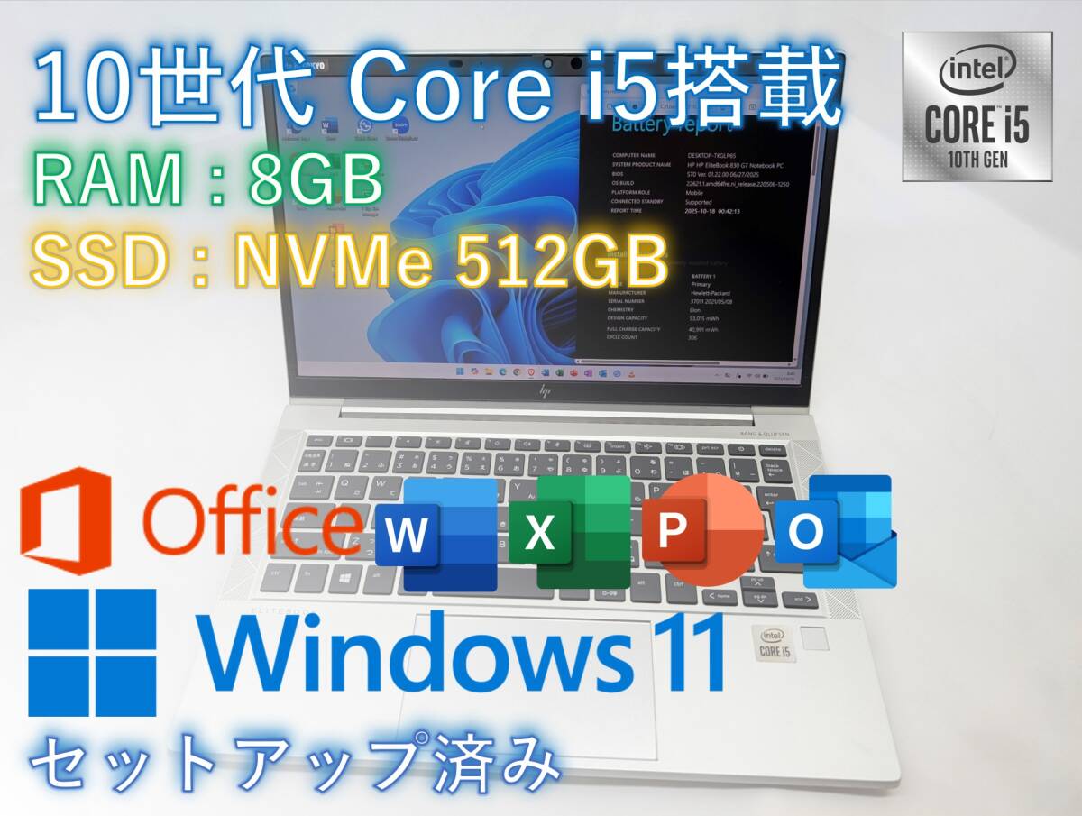 Windows11搭載 10世代 Core-i5 10210u RAM-8GB SSD-512GB Office Word Excel PowerPoint Zoom HP EliteBook 830 G7【10008】