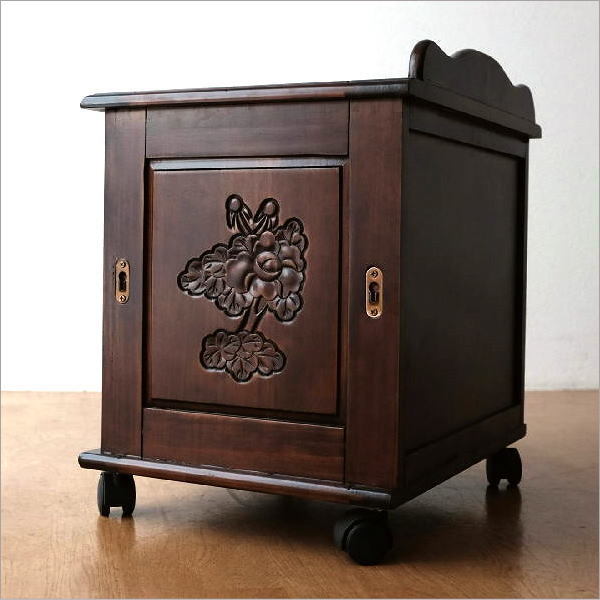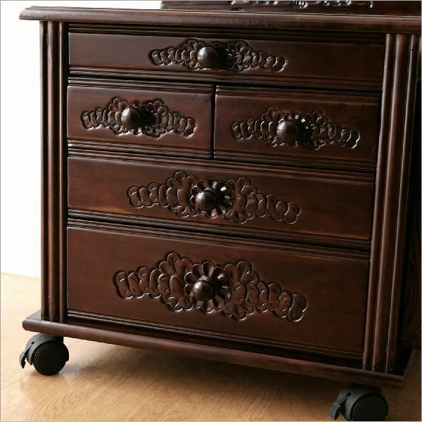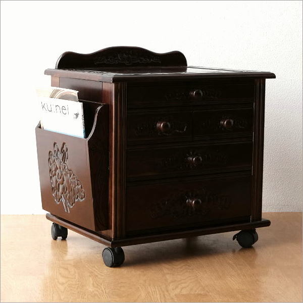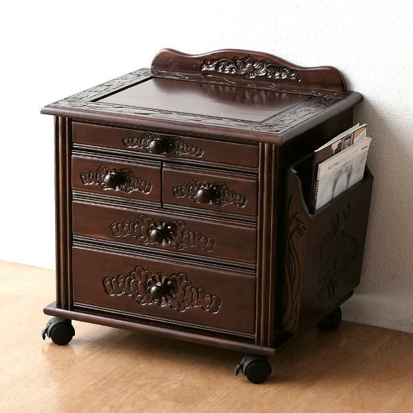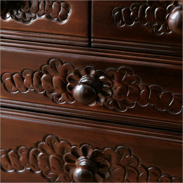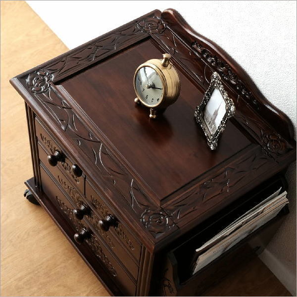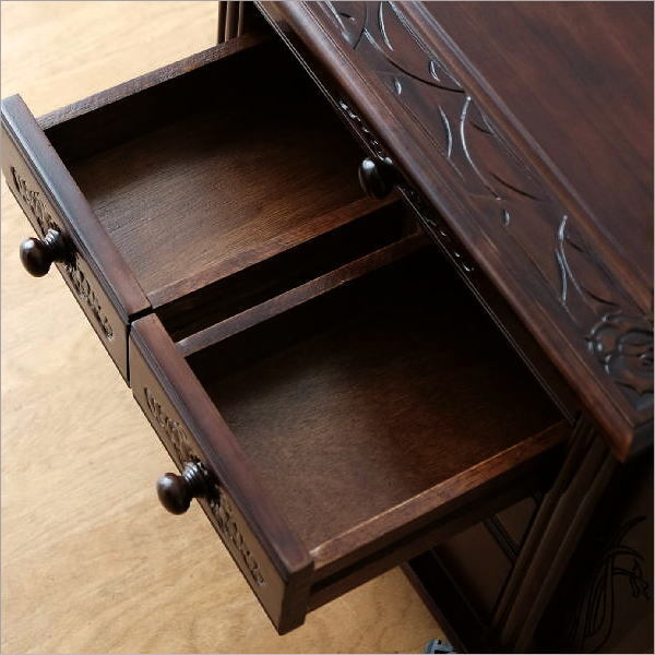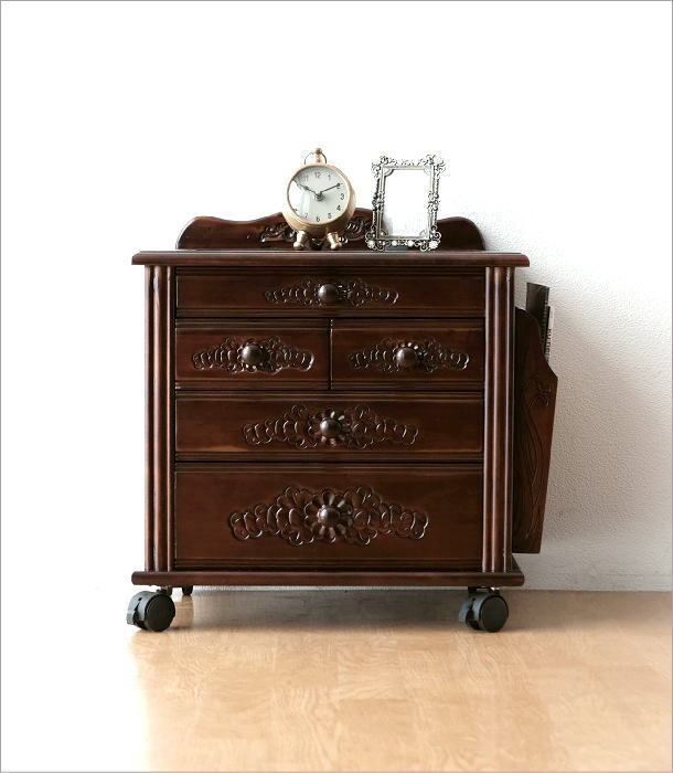 | クラシックで上品な雰囲気ただよう アンティークな家具の世界… 一緒に置いたり飾ったりする小物も いっそう上品な印象を与えます 花模様などの飾り彫刻や 緩やかなカーブを描いた背板など シックなカラー気品と重厚感が漂う 存在感たっぷりの個性派フェイスの家具は アジアン、エスニック、アンティーク リゾート風、和風など 幅広いインテリアに似合いそうです キャスター付きで移動が楽な 小さな引き出しが5個付いたチェスト 置き場所に合わせて マガジンラックは左右どちらへも 付け替えられるのも便利です 商品名 : アンティークなマガジンポケット付きキャスターチェスト 商品番号 : diz8116 全体サイズ(cm) : 幅48.5×奥行36×高さ48.5 天板サイズ : 幅45×奥行33.5~35×背板高さ3.5~5 引出内寸 : 上から 1段目)幅31.5×奥行24×深さ4.5 2段目)幅13.5×奥行24×深さ4.5 ×2 3段目)幅31.5×奥行24×深さ4.5 4段目)幅31.5×奥行24×深さ8.5 ※ストッパー付き 脚内寸 : 幅30×奥行23.5×高さ5 マガジンラック内寸 : 幅25.5×奥行1.5~3×深さ19.5~27 仕様 : キャスター×4 (内ストッパー×2) マガジンラック取り外し可 材質 : 栃 重量 : 約7kg 塗装 : ウレタン 組立状態 : 完成品 生産国 : 中国 ※使用に問題のない細かな仕様変更がある場合がございます ※床のキズ防止フェルトをお付けします ※本物のアンティーク家具ではございません ※アジアン家具特有のアバウトさが見られる商品です ※引き出し内部は塗装の匂いが幾分か致します ※ディスプレイによる色の違いはご了承下さい |