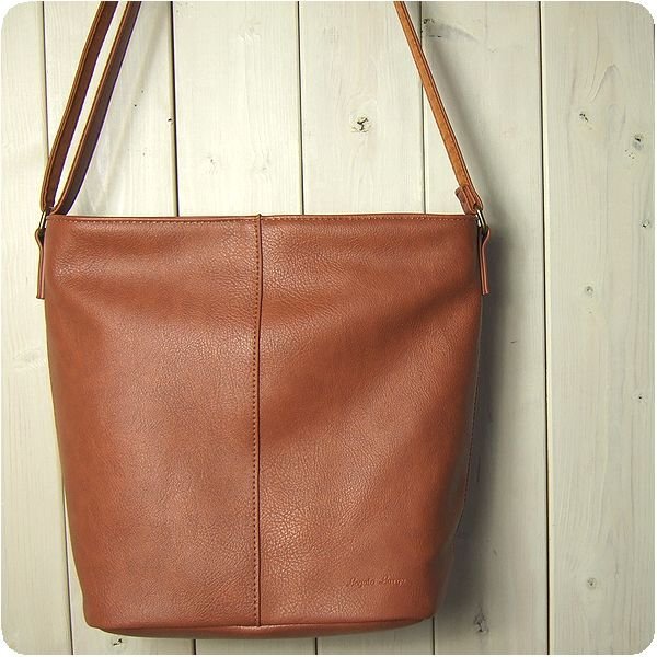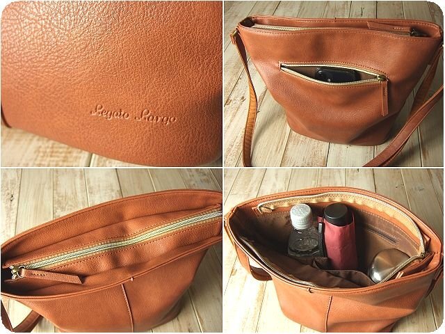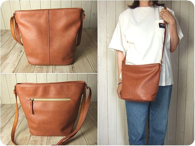 しっとりとしたレザーの質感にボディに馴染むバケツ型のフォルムが◎です。500mlのペットボトルや長財布などもしっかり収納でき、ゴールド系の金具もアクセントになっています。