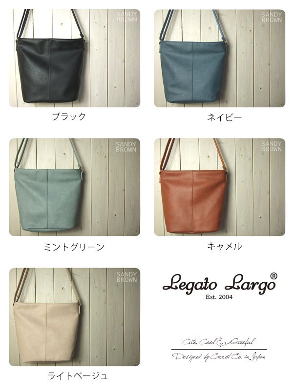 ・質感のよいムラシワ加工のスモーキーフェイクレザーを使用したレガートラルゴ【Legato Largo】のショルダーバッグです。本体ポケットの開閉はファスナータイプ、背面にファスナーポケットが1つ、内側にオープンポケットが2つとファスナーポケットが1つ付いています。ショルダーストラップは幅が1.8センチ、長さは62~116センチの間で調節が可能です。