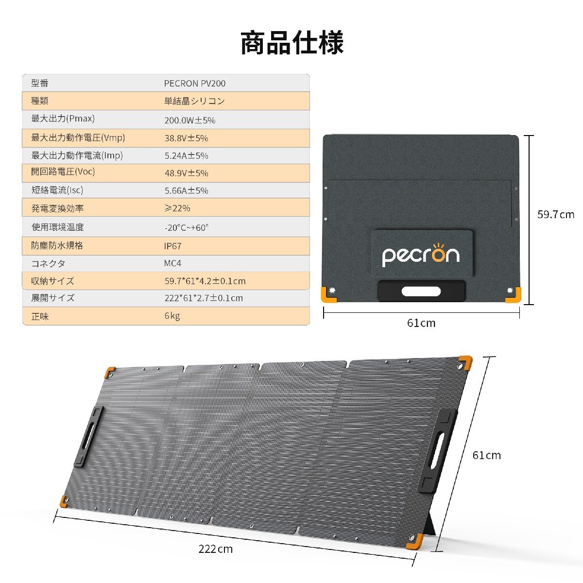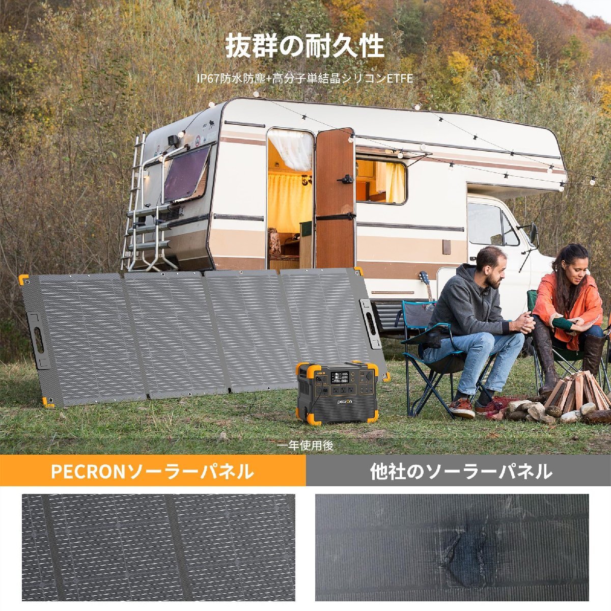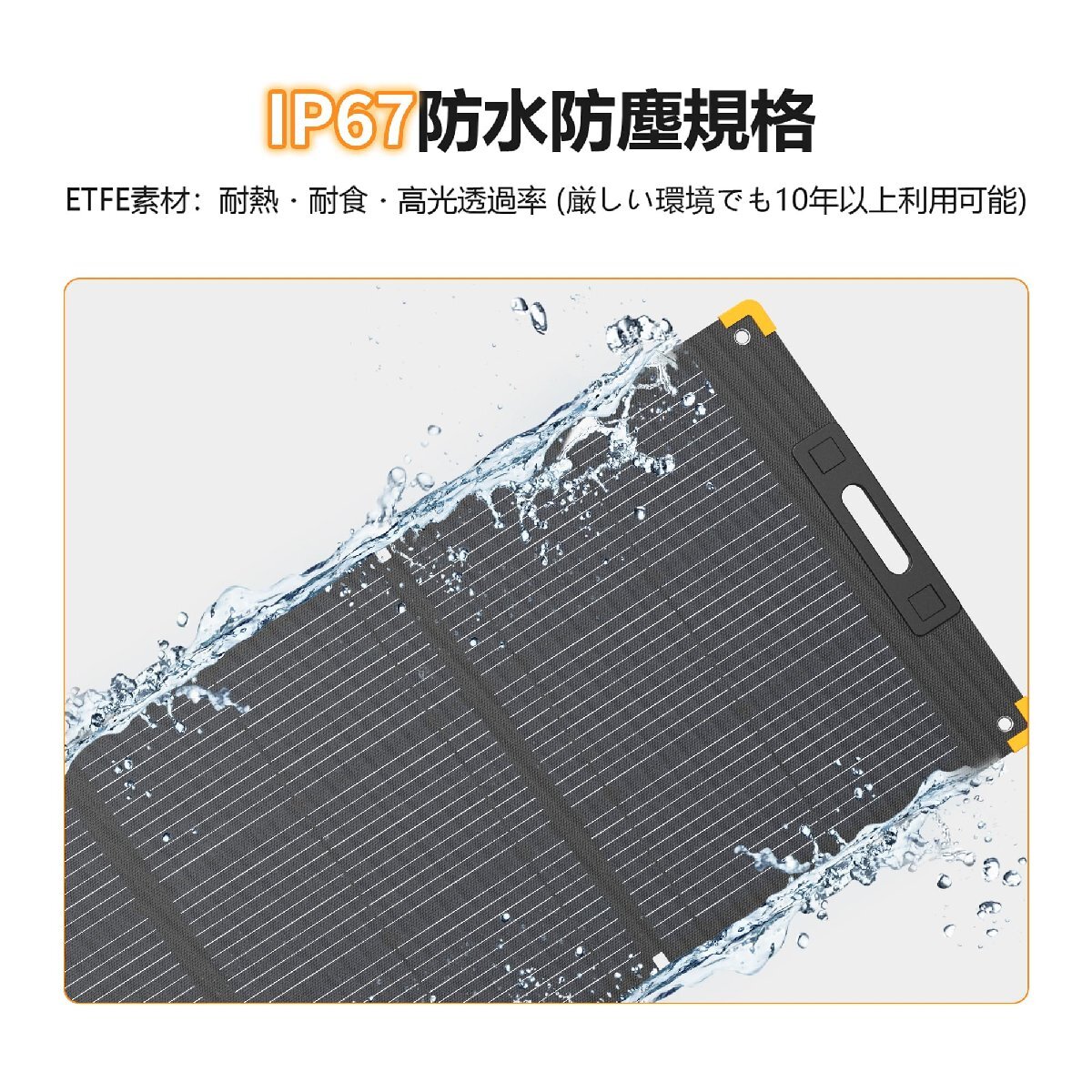 【IP67防水防塵&長持ちのETFE素材】フッ素樹脂コーティングETFEを採用しております。他のフッ素樹脂に比べて塗膜厚が厚く、耐熱・耐食などにも長けており、耐久性などが求められる工業用部品などにも用いられます。ETFE素材採用したPECRONソーラーパネルは光透過率が高く、信頼できる、高温に耐えて、燃え、爆発とか起こりません。防水機能はIP67防水規格となっており、通常のIP65規格より防水性が格段に上がります。