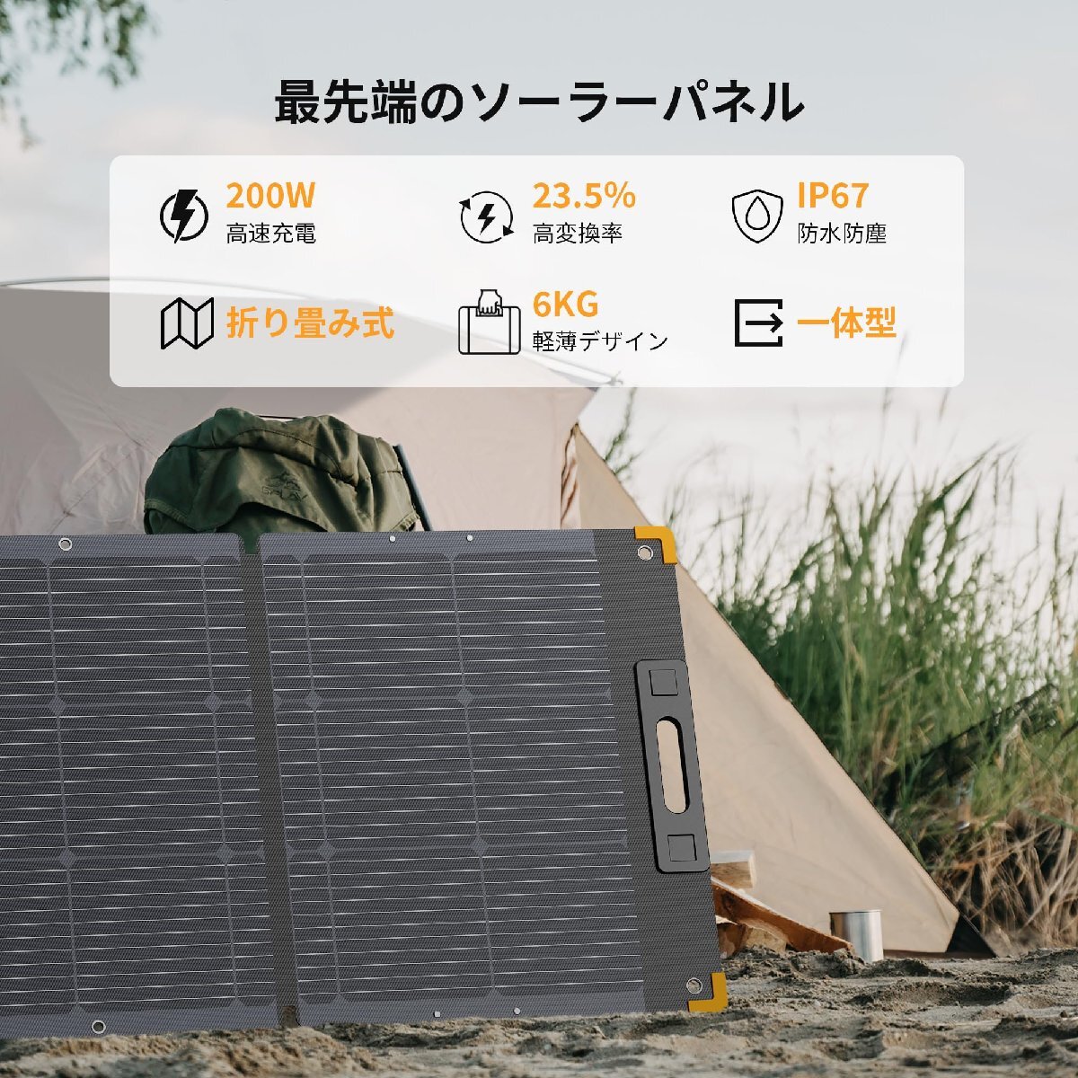 【軽薄な一体型&折り畳み式】200W柔性ソーラーパネルは僅か6kgの重さで、折り畳みが可能で、軽量でどこに連れても便利です。さらに薄くて曲がるソーラーパネルで、カールーフや屋上などいろいろな場所にぴったりフィット。まるで本を開くようにどこでも太陽光が“読める”。一体型のデザインのおかげで、収納や持ち運びが簡単になります。