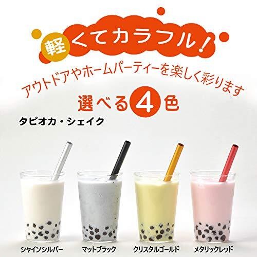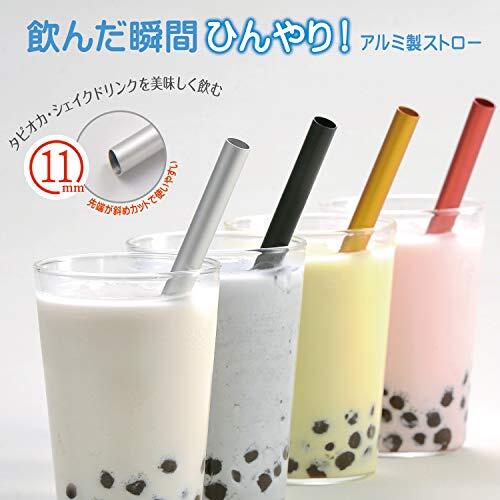 【熱伝導のよいアルミ製ストロー】 アルミニウム製で、一般的なステンレスの12倍の熱伝導 冷たいドリンクから、スムージー、シェイク、タピオカまでさらに冷たく、美味しく 【ずっと使いたいものにこそ、日本で生まれた技術 アルマイト】 表面はアルマイト加工。表面を保護し、腐食、錆に強い アルミは、空気に触れると表面に薄い酸化皮膜を作り、アルミの表面を保護し腐食を防ぐ働きをする この皮膜を人工的に厚く生成したものが「アルマイト」(陽極酸化皮膜) 【軽くてカラフル】 アウトドアやホームパーティーを楽しく彩る 【先端が斜めカットで使いやすい】 先端がストレート形状よりも斜めカットでタピオカも吸いやすい
